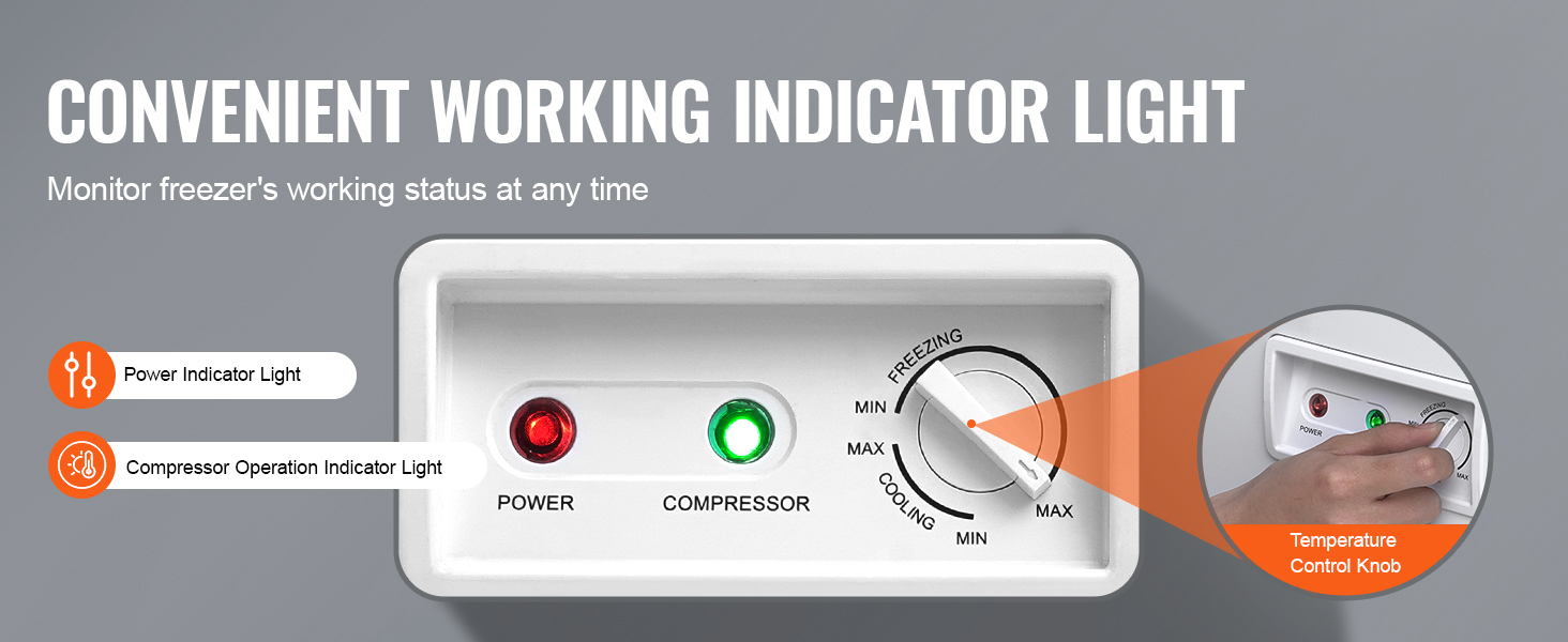 Jednoduše sledujte provozní stav chladničky. Je vybavena kontrolkami napájení a provozu kompresoru spolu s knoflíkem pro nastavení teploty, takže můžete bez námahy kontrolovat stav chlazení chladničky.