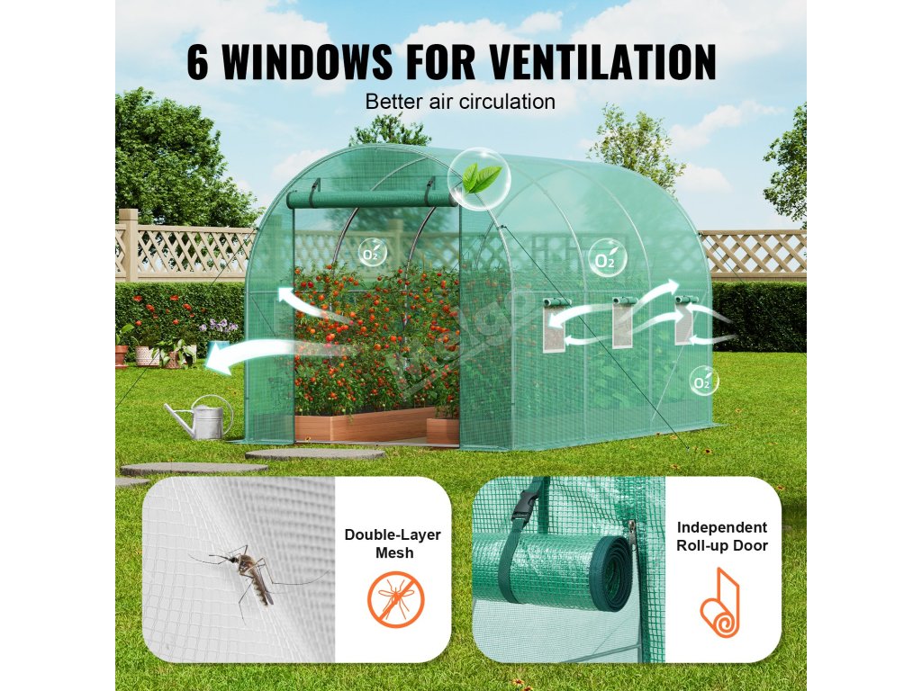 Tento skleník je vybaven okny se síťovinou, která zabraňuje vniknutí malých zvířat a snižuje riziko onemocnění. Dvouvrstvý kryt na zip chrání a okna na suchý zip umožňují snadné nastavení, poskytují vynikající větrání a chrání zdraví rostlin.
