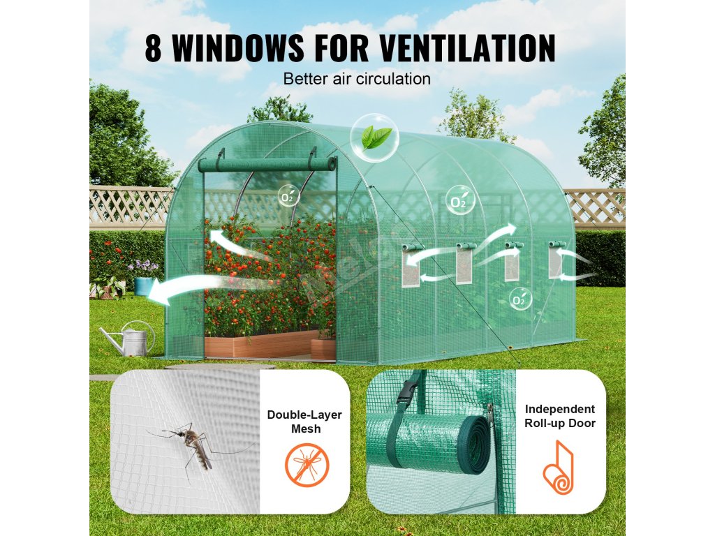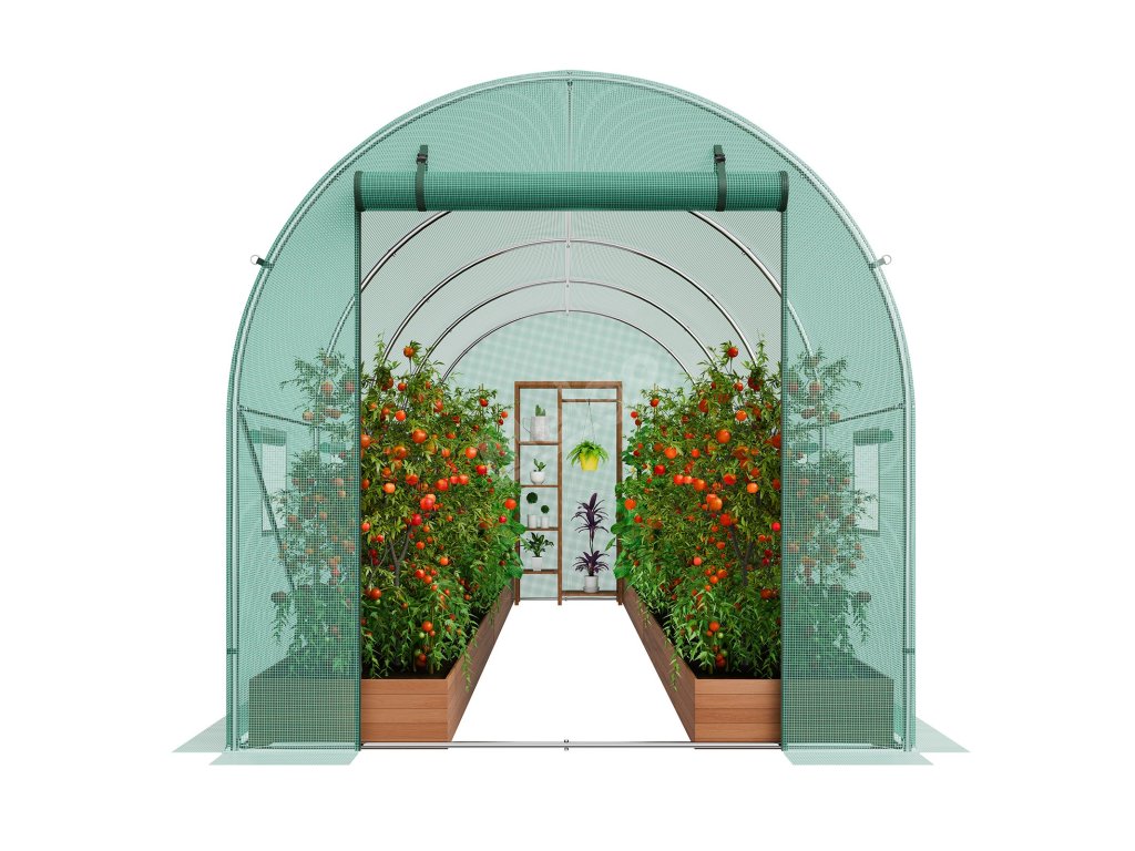 Tento skleník je vybaven okny se síťovinou, která zabraňuje vniknutí malých zvířat a snižuje riziko onemocnění. Dvouvrstvý kryt na zip chrání a okna na suchý zip umožňují snadné nastavení, poskytují vynikající větrání a chrání zdraví rostlin.