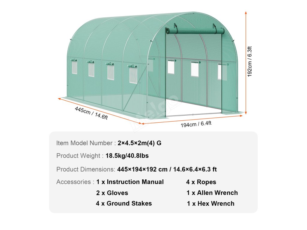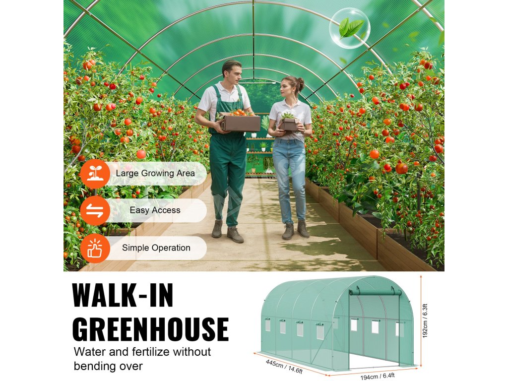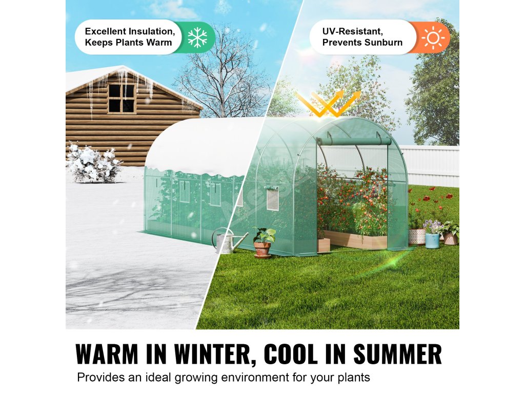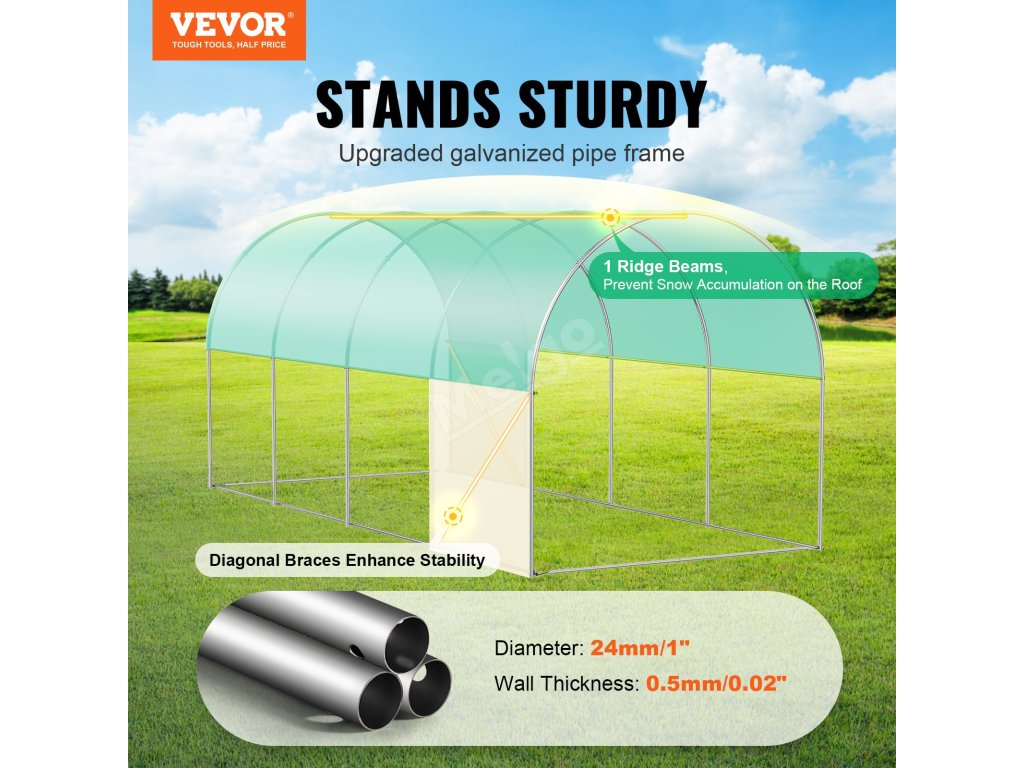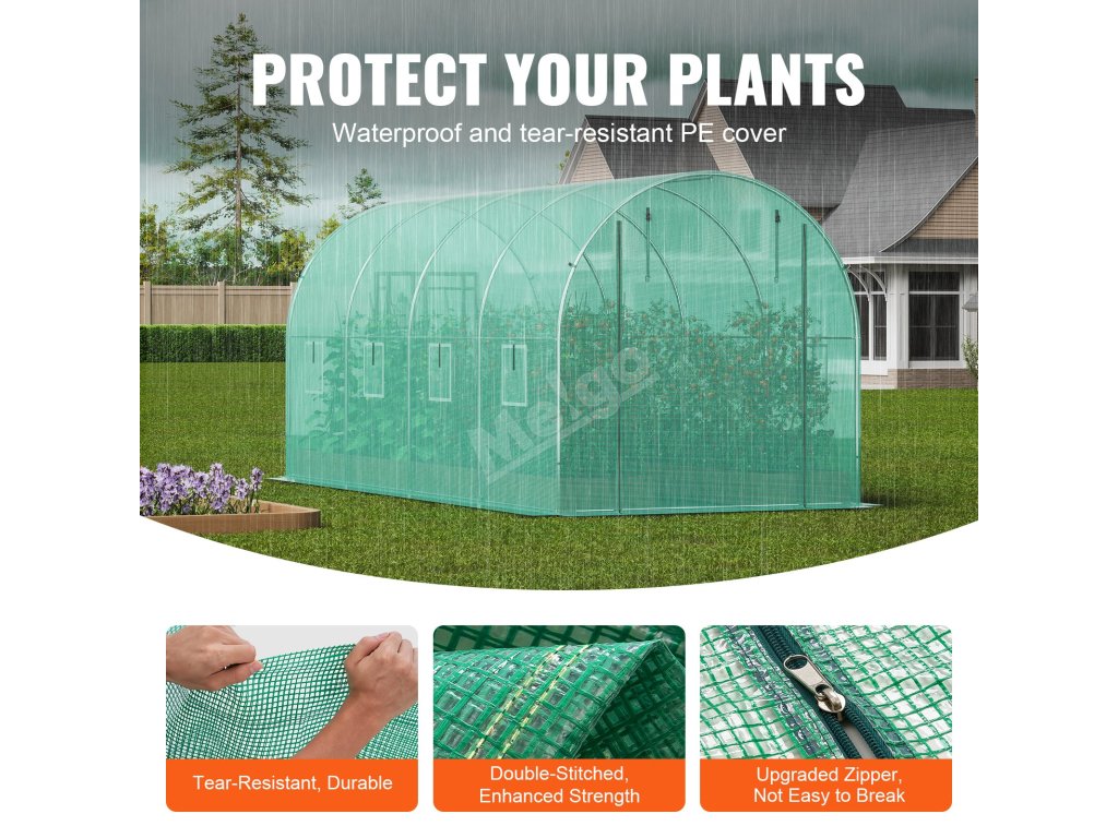 Tento tunelový skleník je zkonstruován z vyztužených pozinkovaných ocelových trubek a odolného PE krytu a poskytuje bezkonkurenční pevnost a odolnost. Jeho prostorný interiér vyhovuje různým potřebám výsadby a umožňuje vašim rostlinám prospívat v příjemném prostředí.