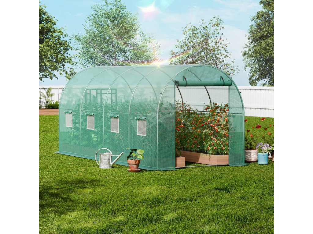 Tunelový skleník 14.6×6.4×6.3 ft, pozinkovaný rám, pe krytí, 8 oken