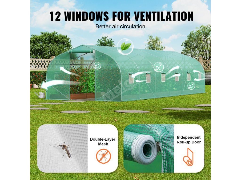 Tento skleník je vybaven okny se síťovinou, která zabraňuje vniknutí malých zvířat a snižuje riziko onemocnění. Dvouvrstvý kryt na zip chrání a okna na suchý zip umožňují snadné nastavení, poskytují vynikající větrání a chrání zdraví rostlin.