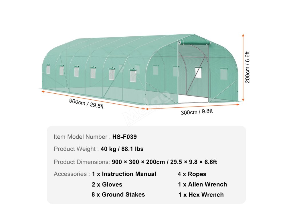 Tento vysoký tunelový skleník se špičatou střechou pro zvýšení nosnosti a zvětšení vnitřního prostoru je podepřen 8 koly ve tvaru písmene U a plastovými háky. Tato robustní konstrukce zajišťuje stabilitu a umožňuje odolávat nepříznivým povětrnostním podmínkám, aniž by se deformoval nebo zhroutil.