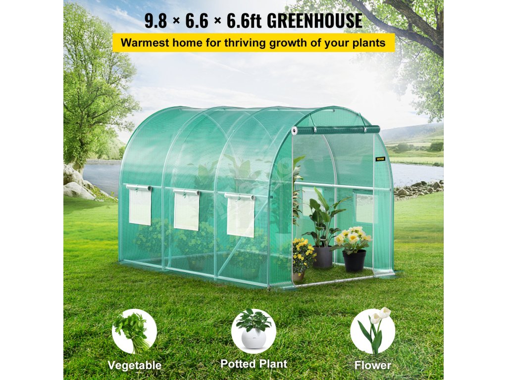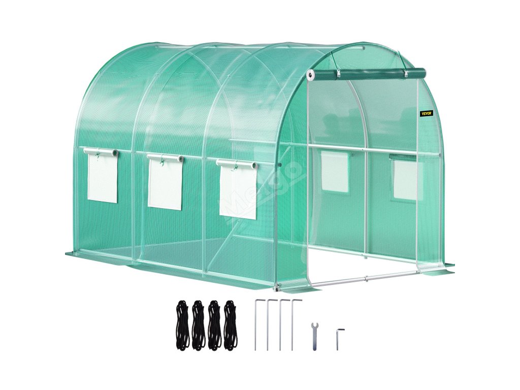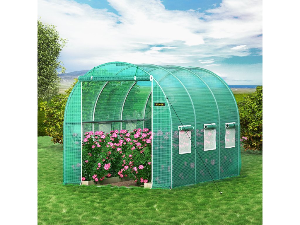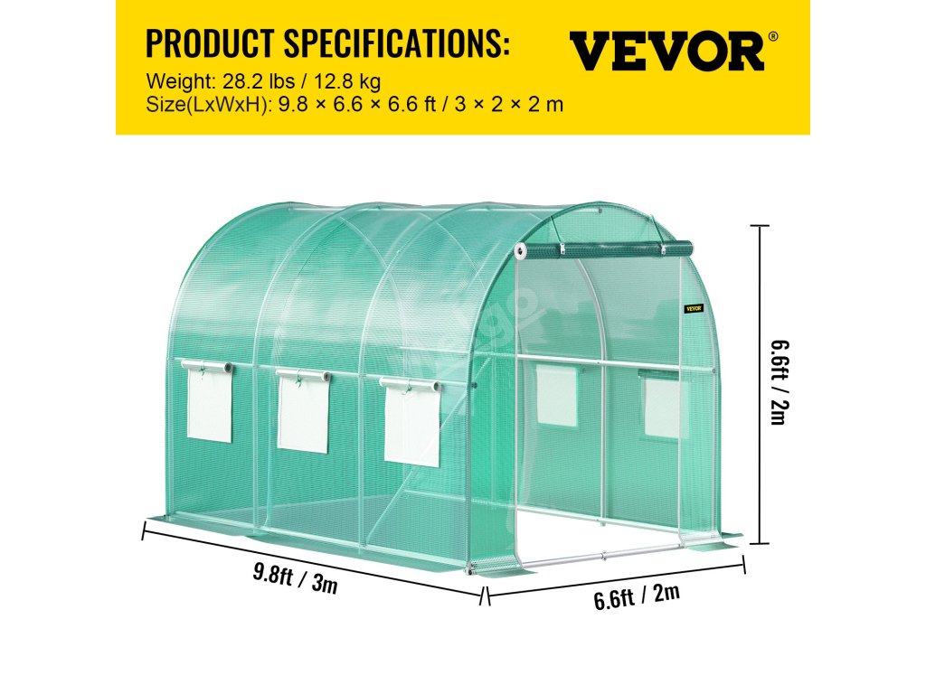 Rozměry: 9,8 x 6,6 x 6,6 stop / 3 x 2 x 2 m. Náš tunelový skleník má velký úložný prostor s jedněmi dveřmi a 6 okny se síťkou, která zvyšují proudění vzduchu a pomáhají rostlinám prospívat.