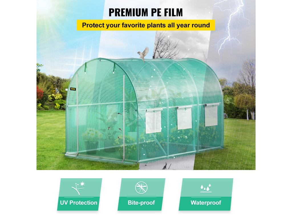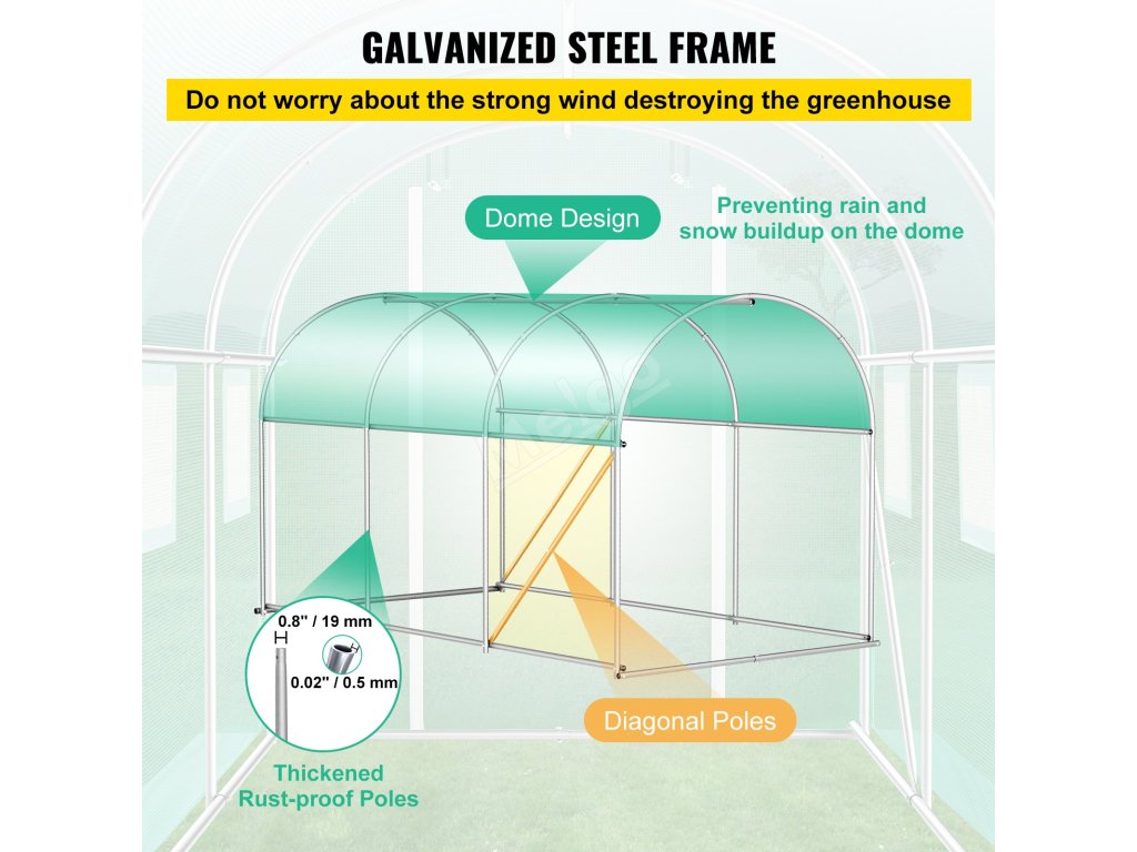 Tento skleník s vysokým tunelem využívá vylepšené, odolné obruče o tloušťce 0,02" a průměru 0,8". Pozinkovaná povrchová úprava je odolná proti korozi pro dlouhodobé používání.