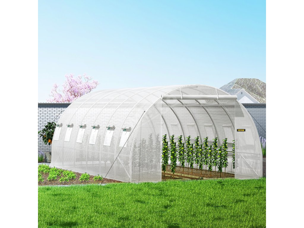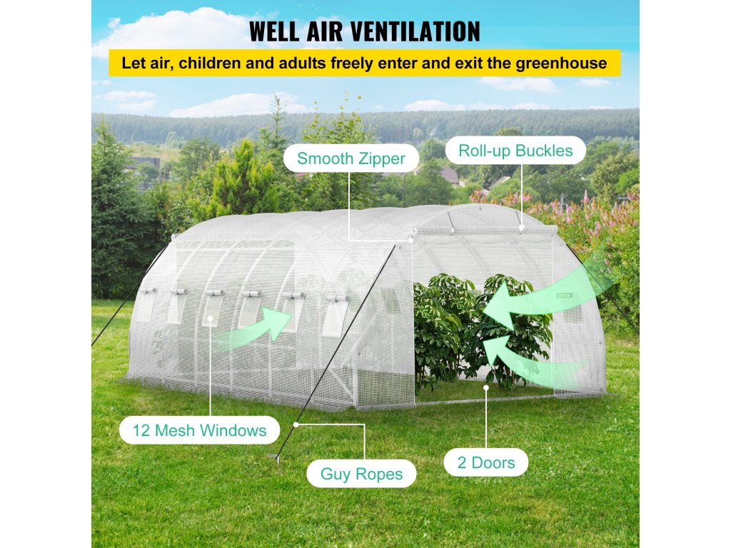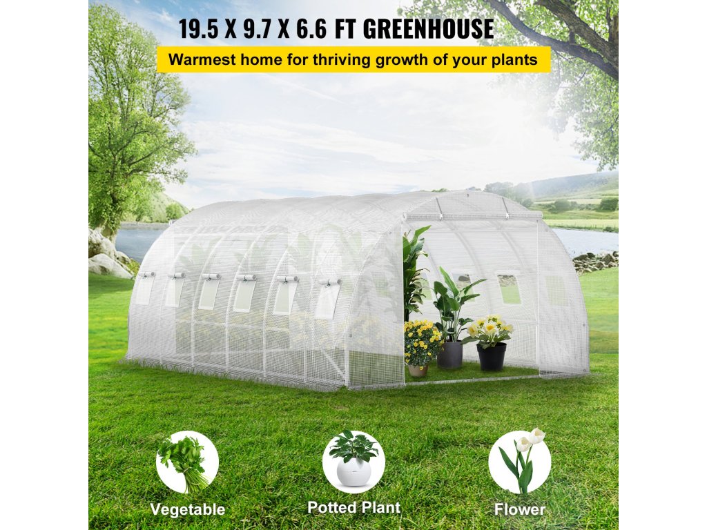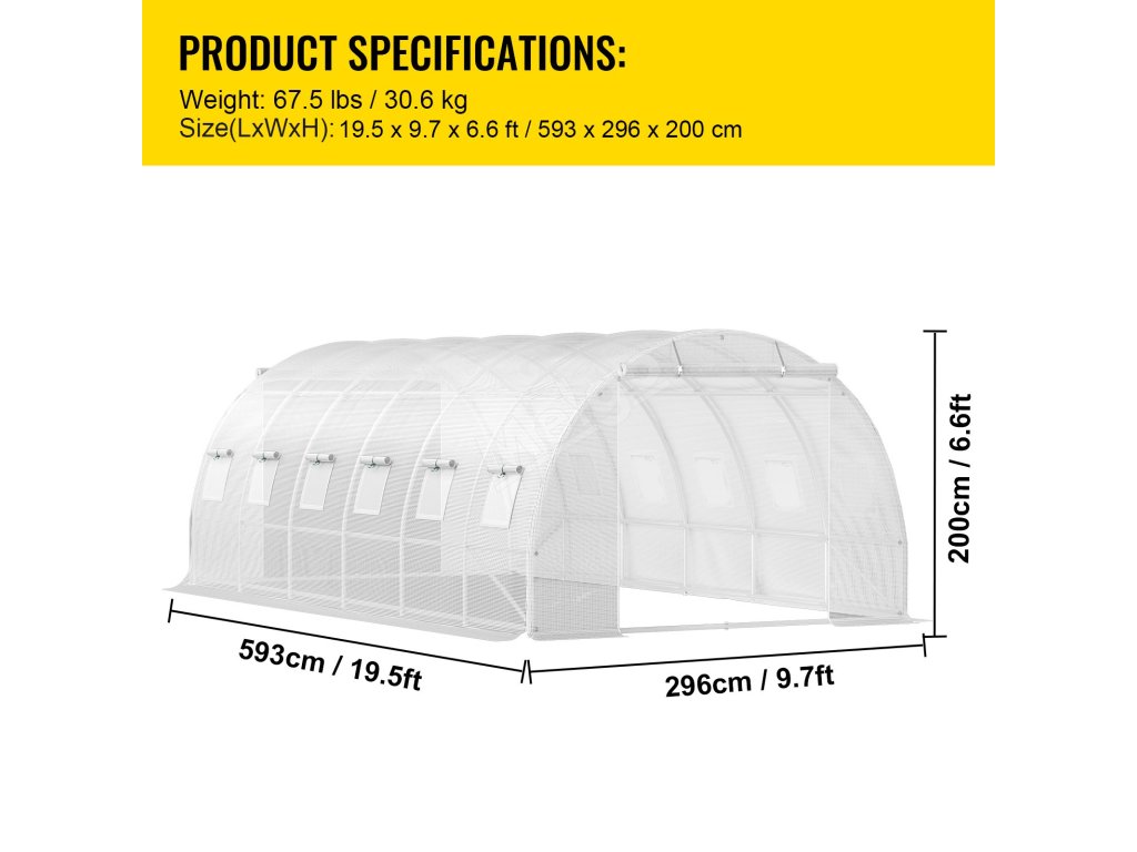 Rozměry: 20 x 10 x 7 stop / 6,1 x 3 x 2,1 m. Náš tunelový skleník má velký úložný prostor se 2 dveřmi a 12 okny se síťovinou, které zvyšují proudění vzduchu a pomáhají rostlinám prospívat.