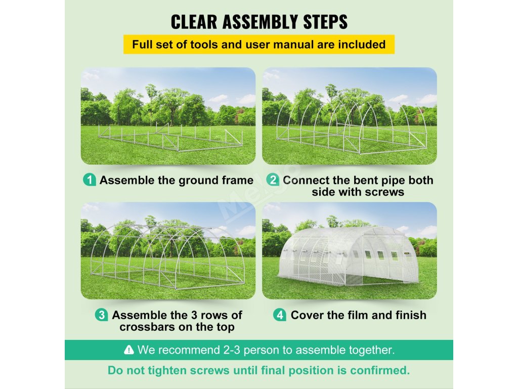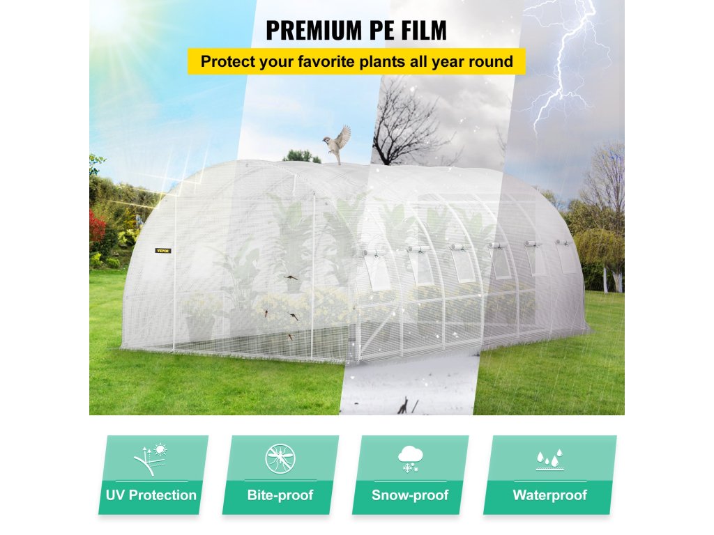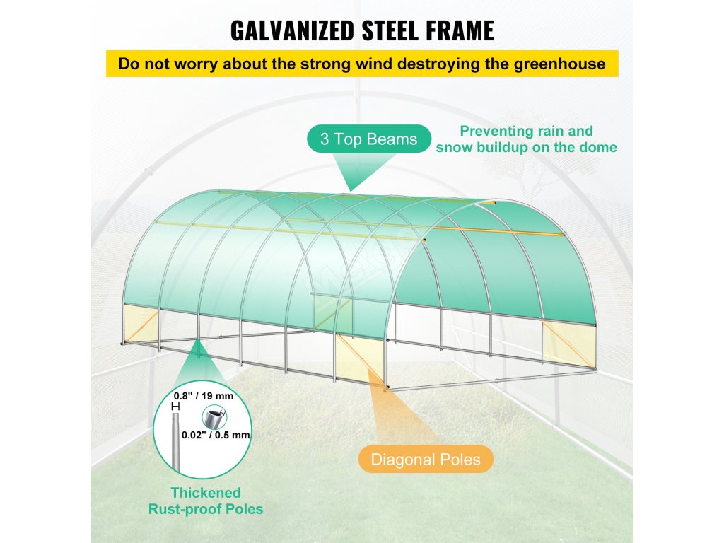 Tento skleník s vysokým tunelem využívá vylepšené, odolné obruče o tloušťce 0,02" a průměru 0,8". Pozinkovaná povrchová úprava je odolná proti korozi pro dlouhodobé používání.