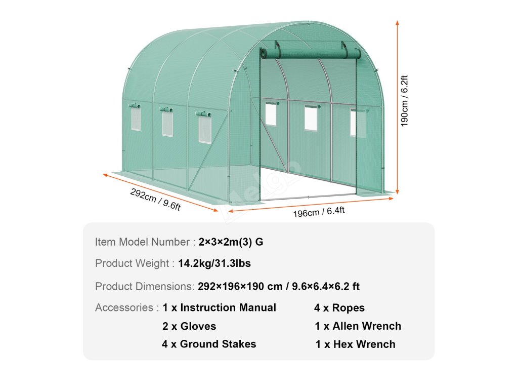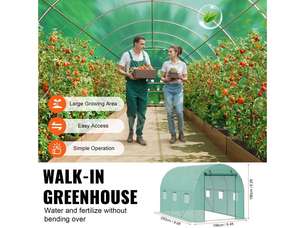Tunelový skleník 9.6×6.4×6.2 ft, pozinkovaný rám, pe plachta, 6 oken