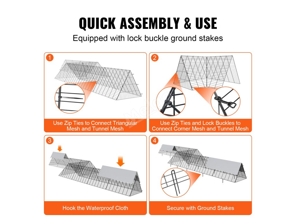 Pro rychlou demontáž stačí odpojit zemnicí kolíky, vázací pásky a zámky, což usnadňuje přemístění tunelu s výběhem pro kuřata. Upravte jeho polohu a orientaci podle ročního období nebo potřeb vaší drůbeže, což je flexibilnější a pohodlnější.