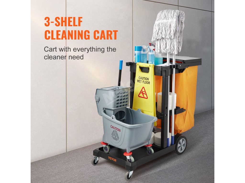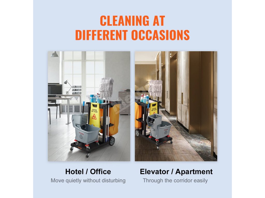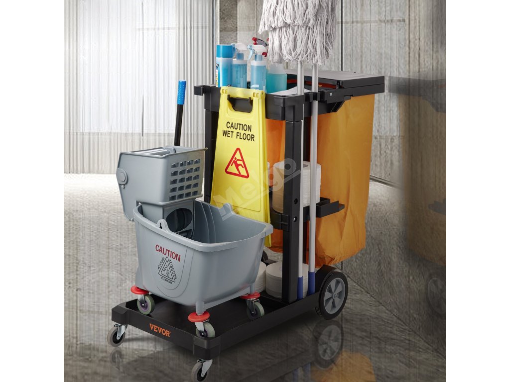 Najlepší upratovací vozík je vyrobený pre komerčné prostredie. Možno ho používať v hoteloch, kanceláriách, na letiskách a ďalších miestach. Odolná konštrukcia vozíka zaručuje, že zvládne veľké zaťaženie. Vozík je vyrobený z vysokopevnostného PP materiálu a 25-galónové PVC vrecko je odolné proti opotrebovaniu a pevné. Mobilita vám pomôže udržať pracovný priestor čistý a organizovaný. Tento vozík by mal byť základným nástrojom pri každom komerčnom upratovaní.