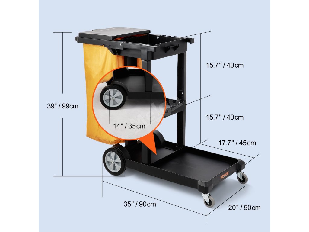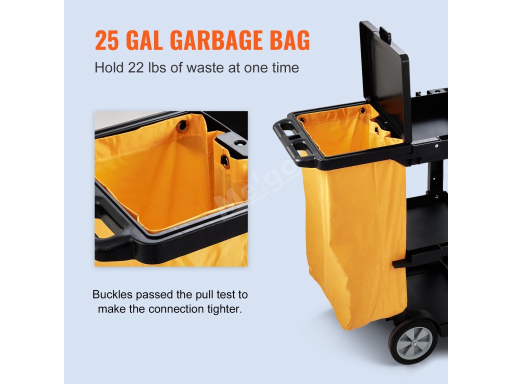 Plastový upratovací vozík VEVOR je vybavený silným 25galónovým vrecom z PVC. Má bezpečnú a organizovanú nosnosť 22 lbs. Vďaka tomu je ideálny na manipuláciu s veľkým množstvom odpadu. Materiál odolný proti opotrebovaniu zaručuje dlhodobé používanie. Dá sa vrece ľahko zavesiť a používať? Áno, krúžky na zapínanie prešli prísnymi skúškami na ťahanie. Zabezpečujú, že vrecko zostane bezpečne na svojom mieste. Robustná konštrukcia vriec zjednodušuje vaše upratovacie úlohy. Udržíte si poriadok a organizáciu na pracovisku. Vrecko z PVC je základnou funkciou tohto upratovacieho vozíka.