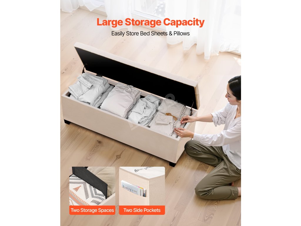 Naše úložná lavice otoman s odklápěcím víkem poskytuje prostorný vnitřní prostor pro uložení ložního prádla, knih nebo věcí denní potřeby. Do dvou bočních kapes lze uložit drobné předměty, jako jsou dálkové ovladače nebo telefony. Tato úložná lavice nejen šetří místo a umožňuje rychle najít, co potřebujete.