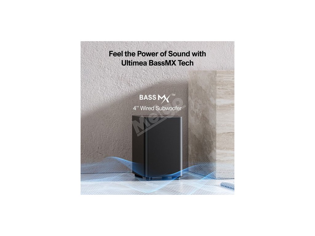 Soundbar Ultimate TV je vybaven 4" kabelovým subwooferem s technologií BassMX, která zesiluje nízkofrekvenční zvuk. Jeho speciálně navržená konstrukce vytváří bohaté a hluboké basy, které s působivou silou umocňují akční scény a výbuchy.