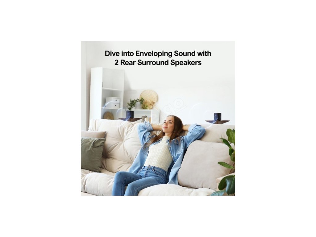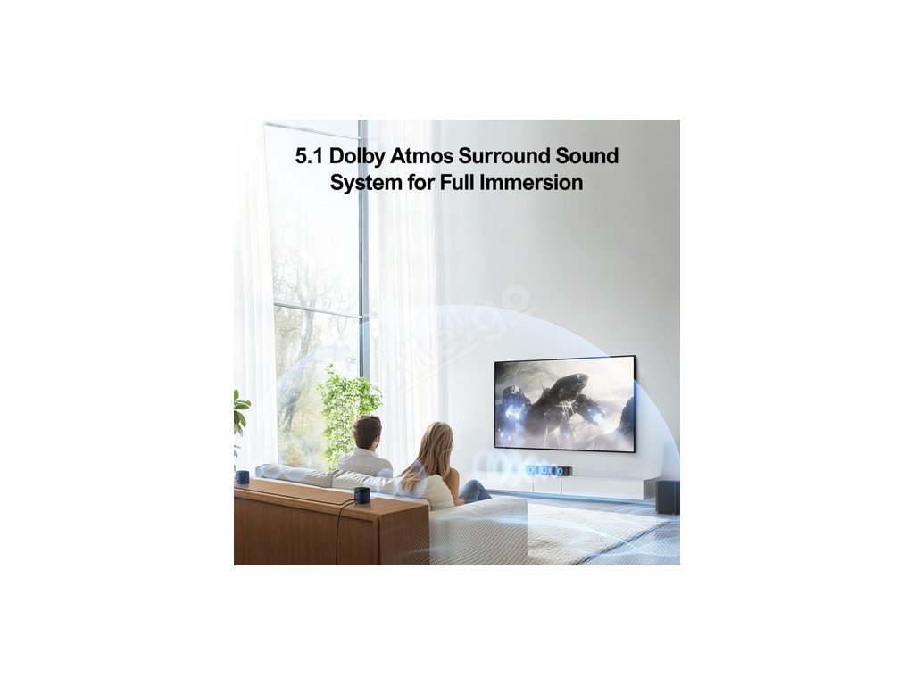Oba prostorové reproduktory jsou připojeny kabely, zatímco pravý prostorový reproduktor se k hlavnímu soundbaru připojuje bezdrátově, což zajišťuje stabilní výkon a pohlcující zvuk s minimem kabelů. Algoritmus SurroundX transformuje zvuk 2.0 PCM na prostorový signál 5.1 a vytváří dynamický zvukový zážitek, který vás obklopí - ideální pro filmy, hry a hudbu.