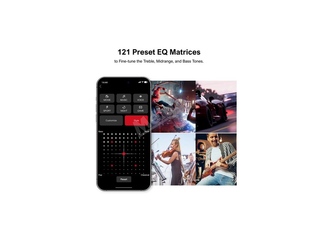 Vylaďte si zvukový zážitek jako nikdy předtím s aplikací Ultimea. Nabízí 121 odborných předvoleb ekvalizéru v žánrech, jako jsou basy, pop, klasika a rock, a navíc 10 pásem a 6 přizpůsobených režimů ekvalizéru včetně filmového, hudebního, hlasového, sportovního, herního a nočního. Díky pokročilé funkci "Přizpůsobit" můžete zvuk upravit přesně podle svých preferencí a zajistit, aby každý tón zněl přesně tak, jak se vám líbí.