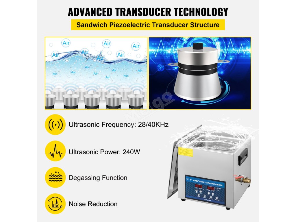 40KHz ultrazvukové vlny pro čištění věcí se složitě tvarovaným povrchem, slepými otvory; 28KHz pro malé nebo jednoduché předměty. Vytváří miliony mikroskopických bublinek, které účinně odstraňují skvrny na povrchu.