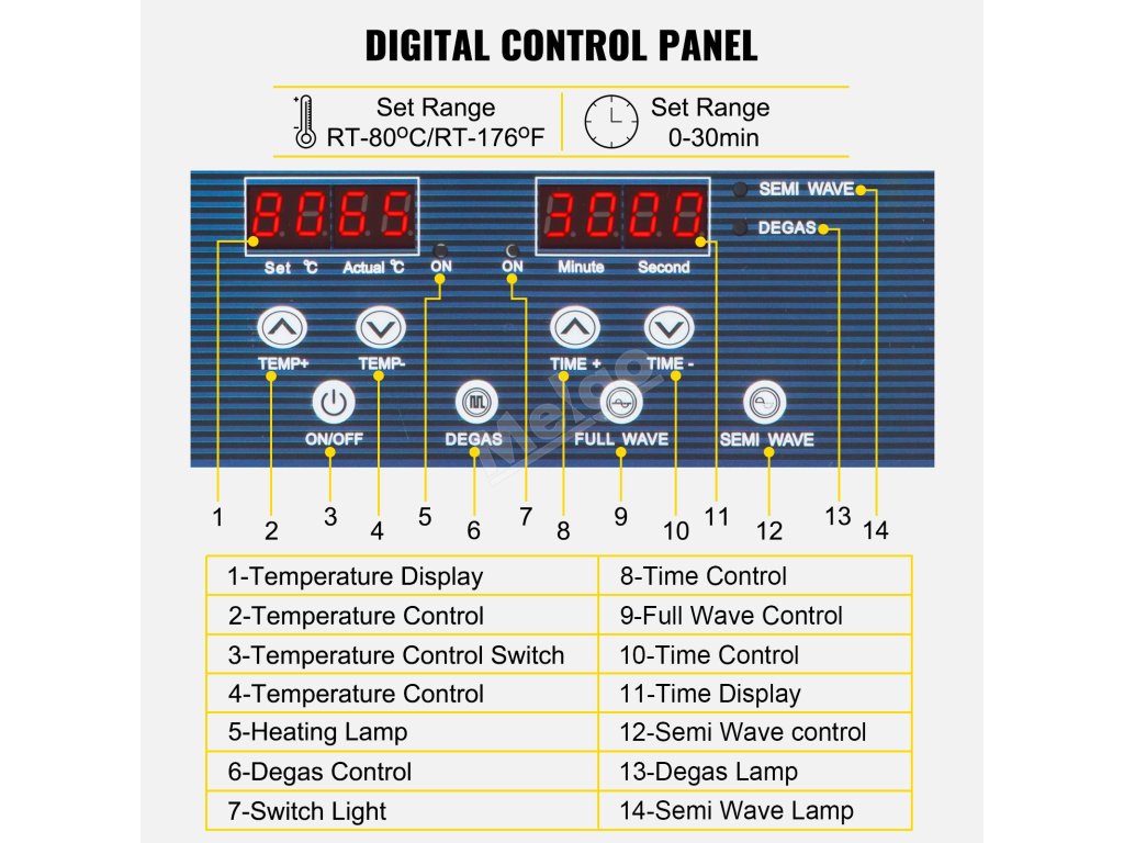 Výkonná konstantní pracovní doba čištění: 0-30 minut (nastavitelná); může také rychle ohřívat roztoky na teplotu 0-80 ℃ (nastavitelná). Mikročipem řízený cyklus ohřevu a čištění. S LED displejem a tlačítky pro zobrazení a volbu režimů.