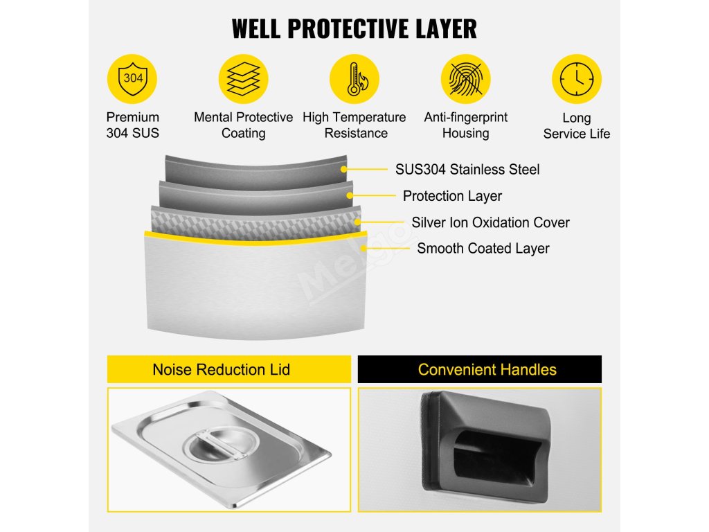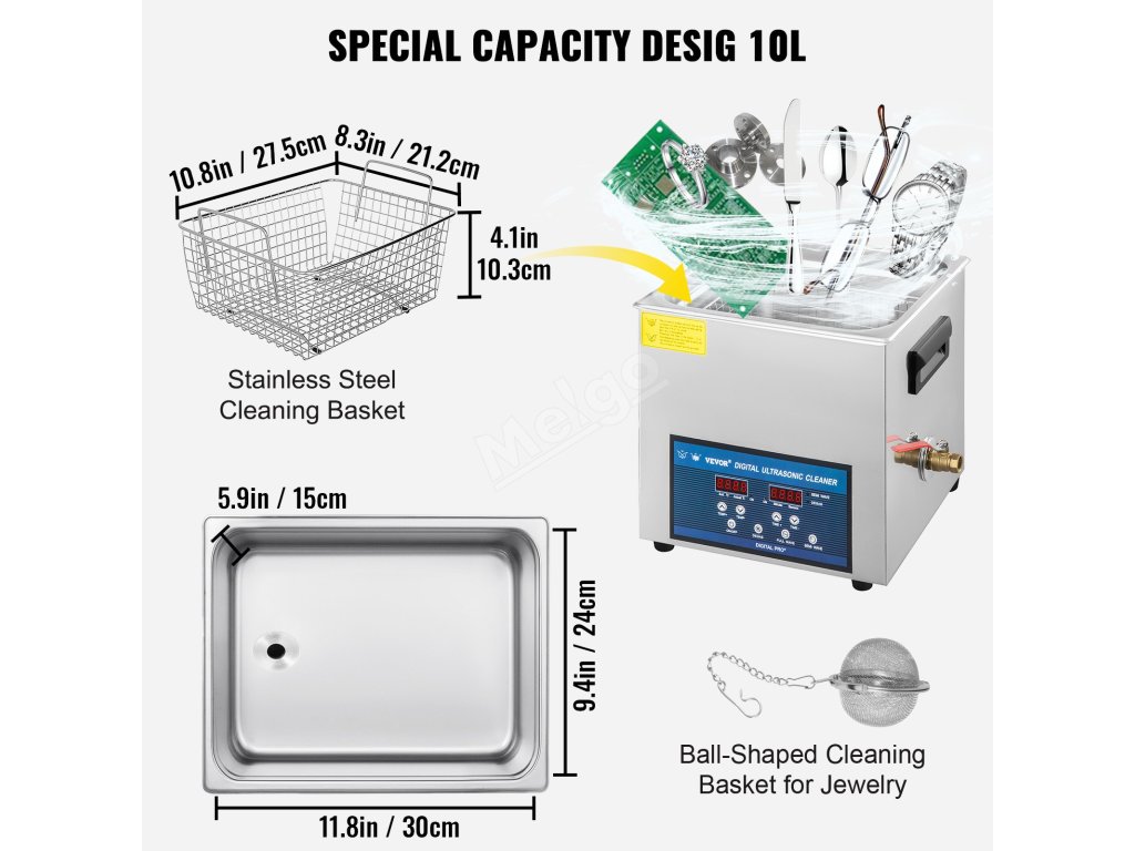velká nádrž o objemu 10 l, vyrobená z nerezové oceli 304 odolné proti korozi a vysokým teplotám, která zaručuje dlouhou životnost. Integrovaný rám, nedochází k úniku vody. 201 nerezový kryt, čistitelný otřením víka. Můžete tak mýt příliš mnoho věcí najednou a zvýšit tak účinnost.