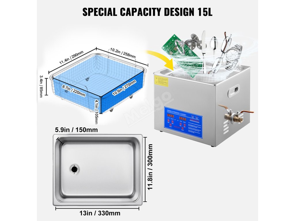 Sonická čistička šperků má velkou nádrž o objemu 15 l/4 galony, která je vybavena čisticím košem pro snížení tření při mytí.