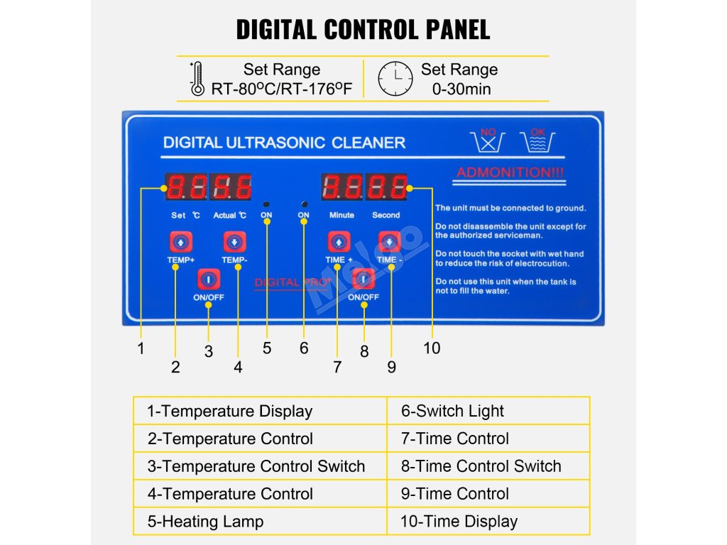 Čas je nastavitelný v rozmezí 0 až 30 minut a teplotu lze nastavit v rozmezí RT-176℉/RT-80 ℃, které se zobrazuje na LED displeji. Funkce ohřevu výrazně zvyšuje účinnost čištění.