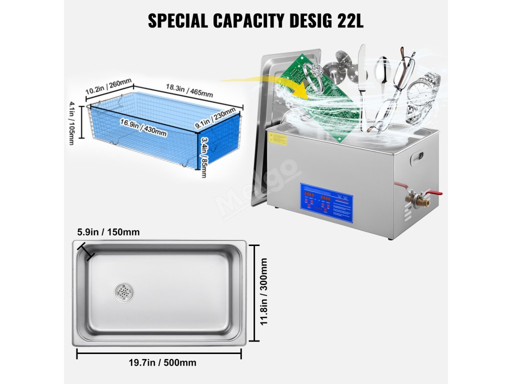 Sonická čistička šperků má velkou nádrž o objemu 22 l/5,8 galonu, která je vybavena čisticím košem pro snížení tření při mytí.