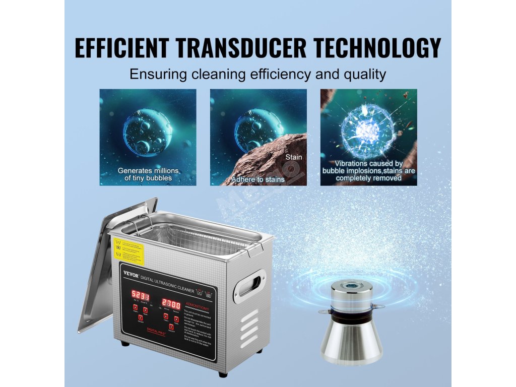 Sonický čistič využívá pokročilou technologii snímačů a generuje 40kHz ultrazvukové vlny, které vytvářejí miliony malých bublinek, účinně pronikají na povrchy a do štěrbin a důkladně čistí nečistoty, aniž by poškodily vzhled nebo kvalitu předmětů.