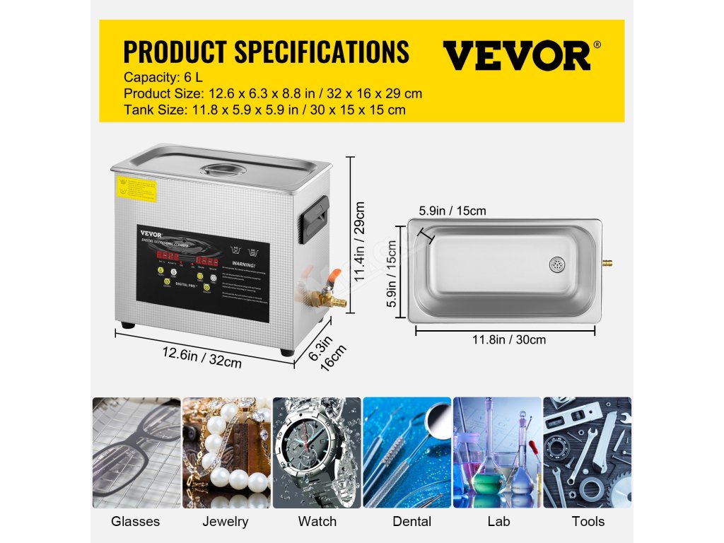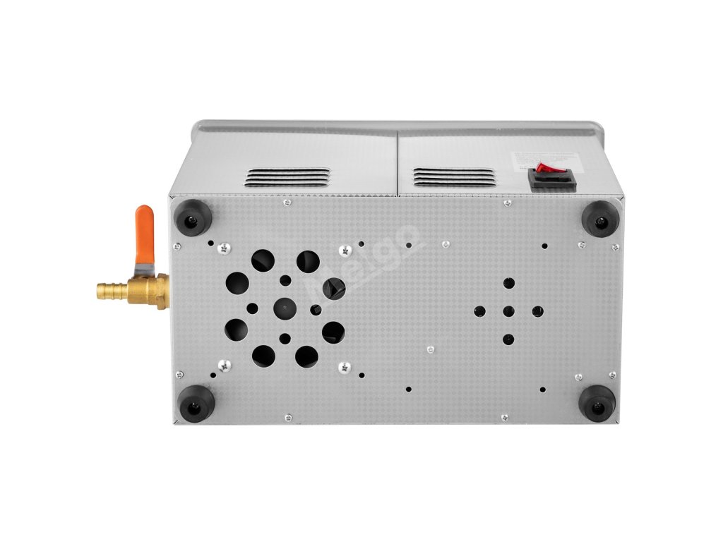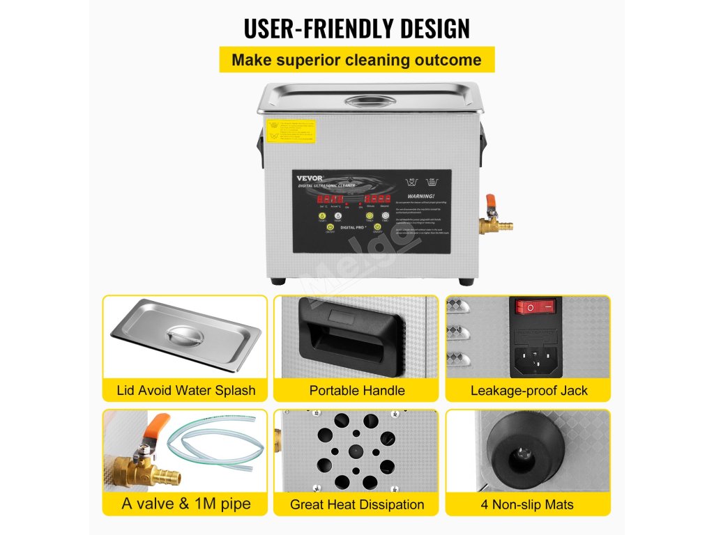 Kompaktní rozměry s velkou nádrží o objemu 6 litrů, která postačuje k důkladnému vyčištění předmětů najednou. Je vybaven vypouštěcím ventilem pro regulaci rychlosti a 1M vodovodní trubkou pro pohodlné používání.