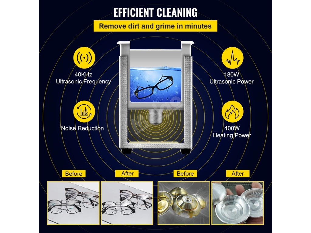 400W topný výkon, 2 importované snímače pro přenos 40KHz ultrazvukových vln. Vytváří miliony mikroskopických čisticích bublinek, které účinně odstraňují nečistoty a špínu na povrchu a v mezeře.