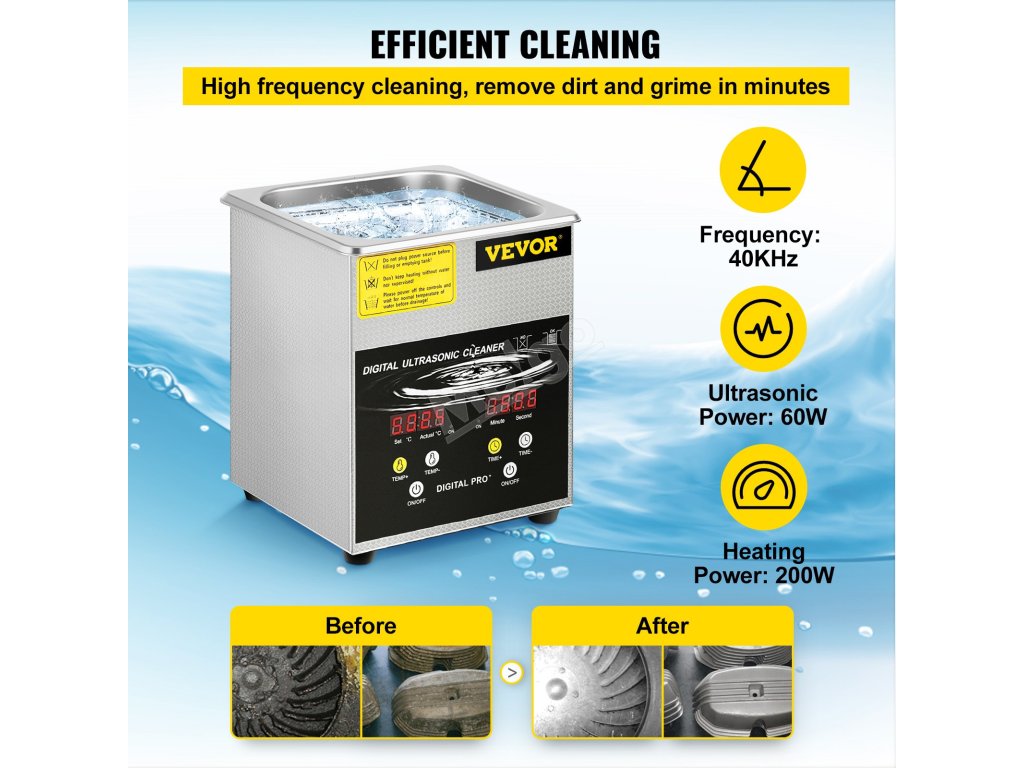 Má 200W topný výkon a vysílá ultrazvukové vlny o frekvenci 40 000 Hz. Vytváří miliony mikroskopických čisticích bublinek, které účinně odstraňují nečistoty a špínu na povrchu. Není třeba používat žádné chemikálie ani drhnutí.