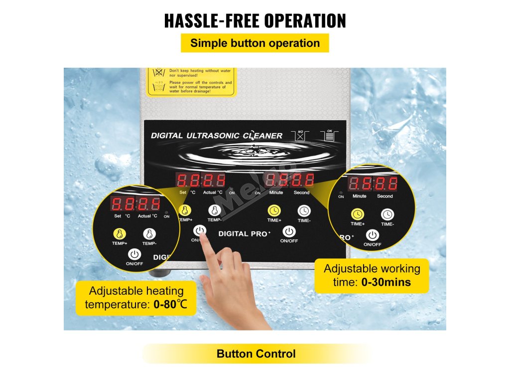 Je vybaven regulátorem času a teploty. Nastavení časovače s regulací od 0 do 30 minut. Nastavitelná teplota 0-80 ℃ pro zvýšení účinnosti ultrazvukového čištění odolných skvrn.