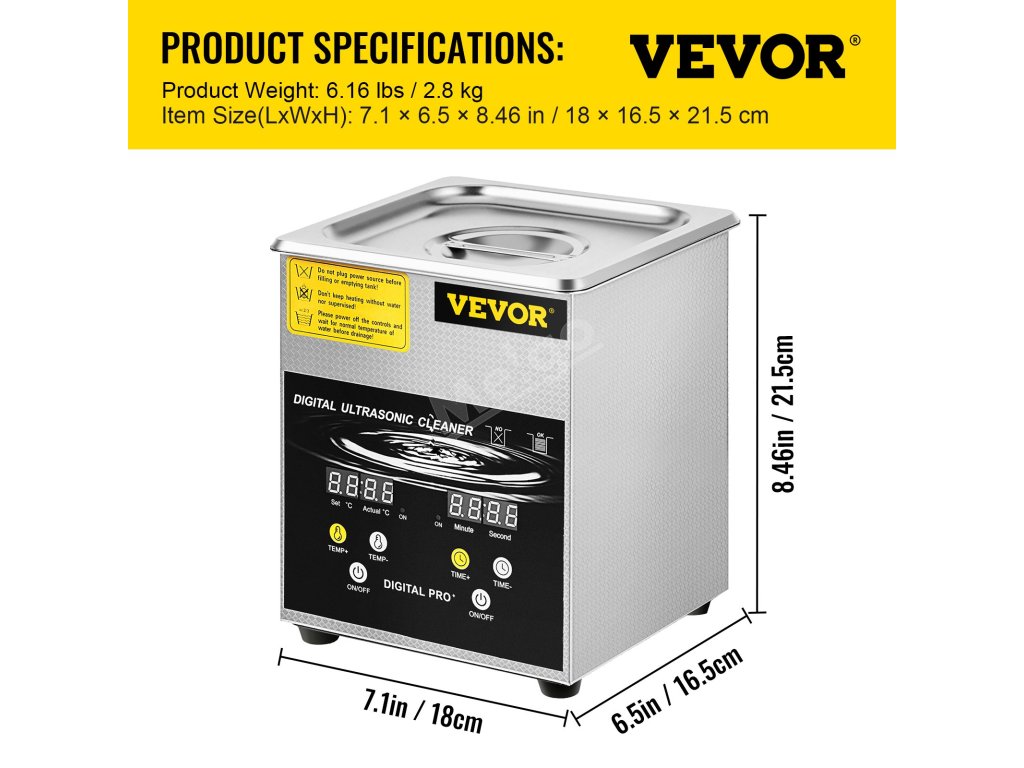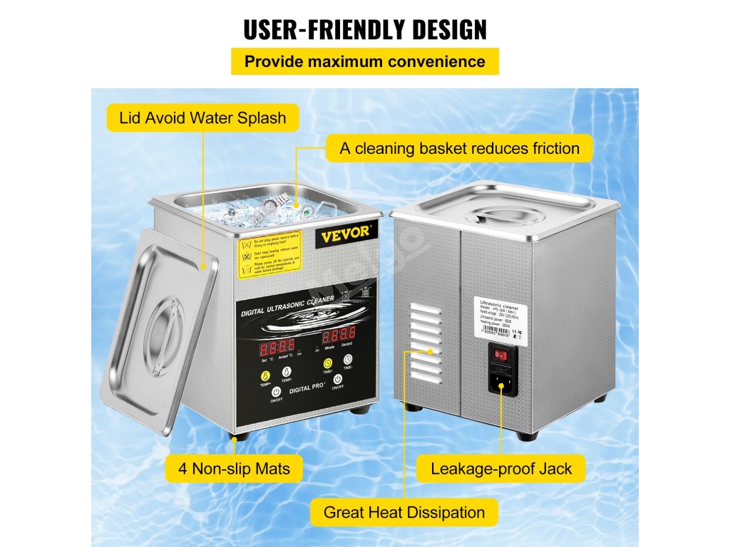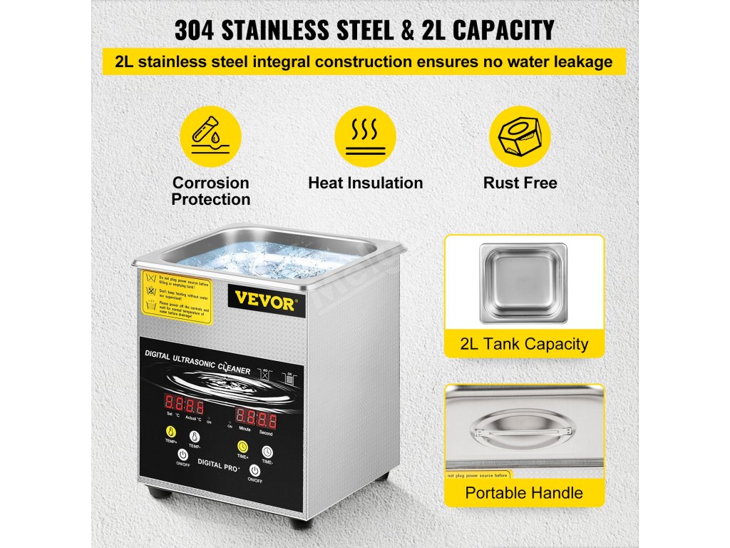 Kompaktní velikost s velkou nádrží o objemu 2 l, která stačí na důkladné vyčištění předmětů na jeden zátah. Šetří čas a námahu. Také s odnímatelným víkem z nerezové oceli, které zabraňuje rozstřiku.