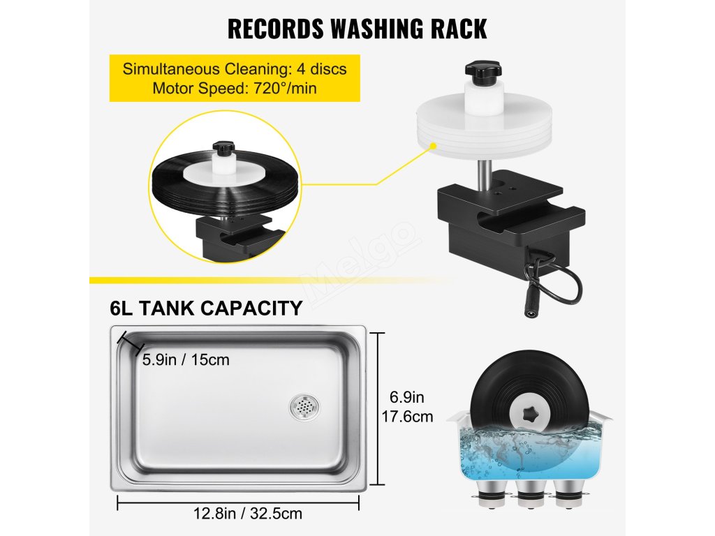 Naše ultra čistička šperků je vybavena odnímatelným stojanem na mytí desek, který lze otáčet výkonným motorem a čistit tak 4 vinylové desky najednou.