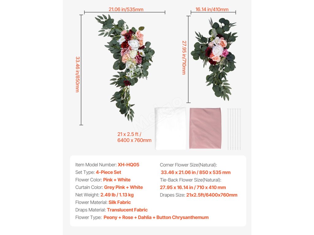 Záves tejto súpravy umelých kvetov na svadobný oblúk s dĺžkou 21 stôp možno zavesiť alebo prevesiť a vytvoriť tak na mieste konania podujatia vrstvy romantiky. Slúži aj ako všestranný dekoratívny prvok, ktorý dodá eleganciu akémukoľvek prostrediu