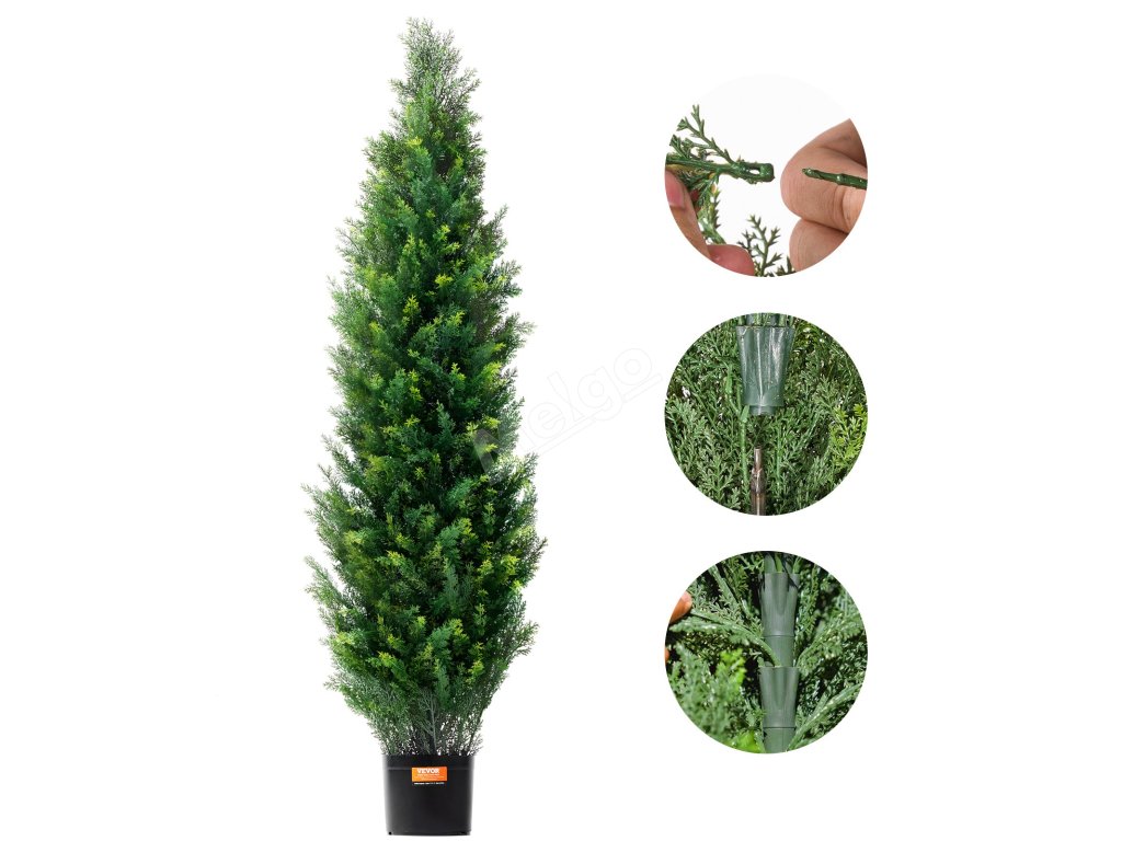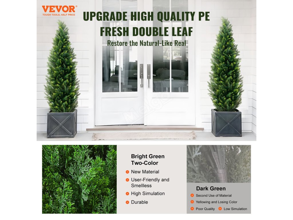 Tento umělý stromek zůstává zelený po celý rok bez nutnosti údržby - není třeba jej zalévat, hnojit ani stříhat. Je vyroben z vysoce kvalitních PE listů, které zajišťují realistický vzhled a trvanlivost, odolává blednutí a hodí se do každého prostoru, takže snadno vytvoří přirozený vzhled.