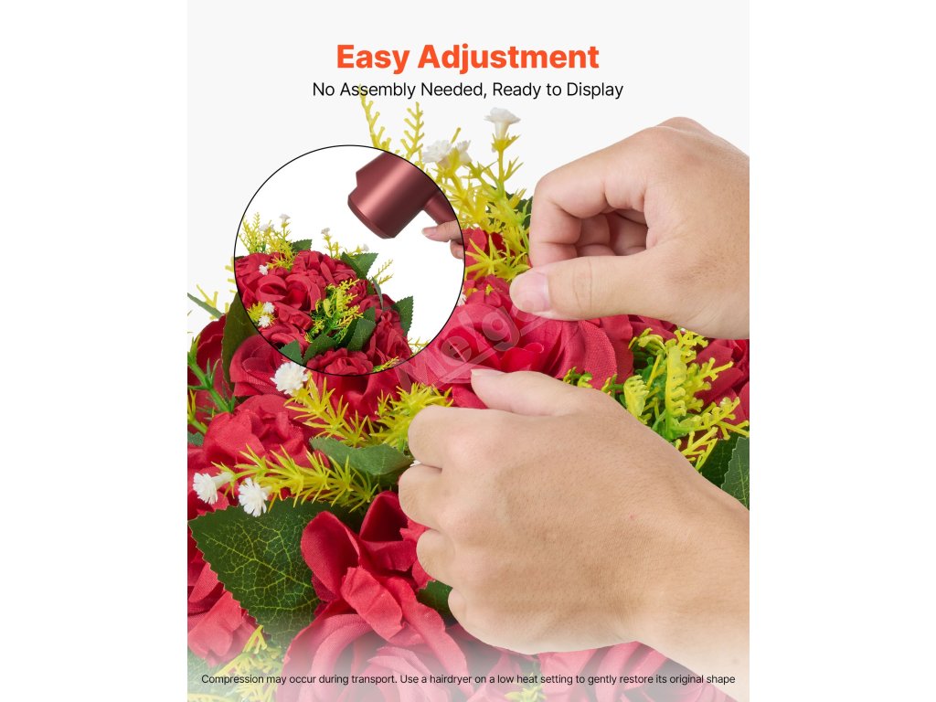 A2: Ano, každá květinová koule je pro vaše pohodlí kompletně sestavena. Vzhledem k balení může dojít k mírnému stlačení. Jednoduše použijte fén na několik sekund na nízkou teplotu a jemně rozložte okvětní lístky rukou, abyste obnovili jejich tvar.