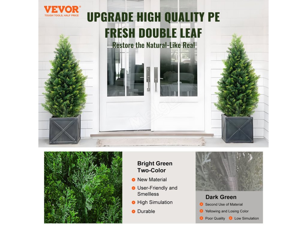 Tento umělý stromek zůstává zelený po celý rok bez nutnosti údržby - není třeba jej zalévat, hnojit ani stříhat. Je vyroben z vysoce kvalitních PE listů, které zajišťují realistický vzhled a trvanlivost, odolává blednutí a hodí se do každého prostoru, takže snadno vytvoří přirozený vzhled.