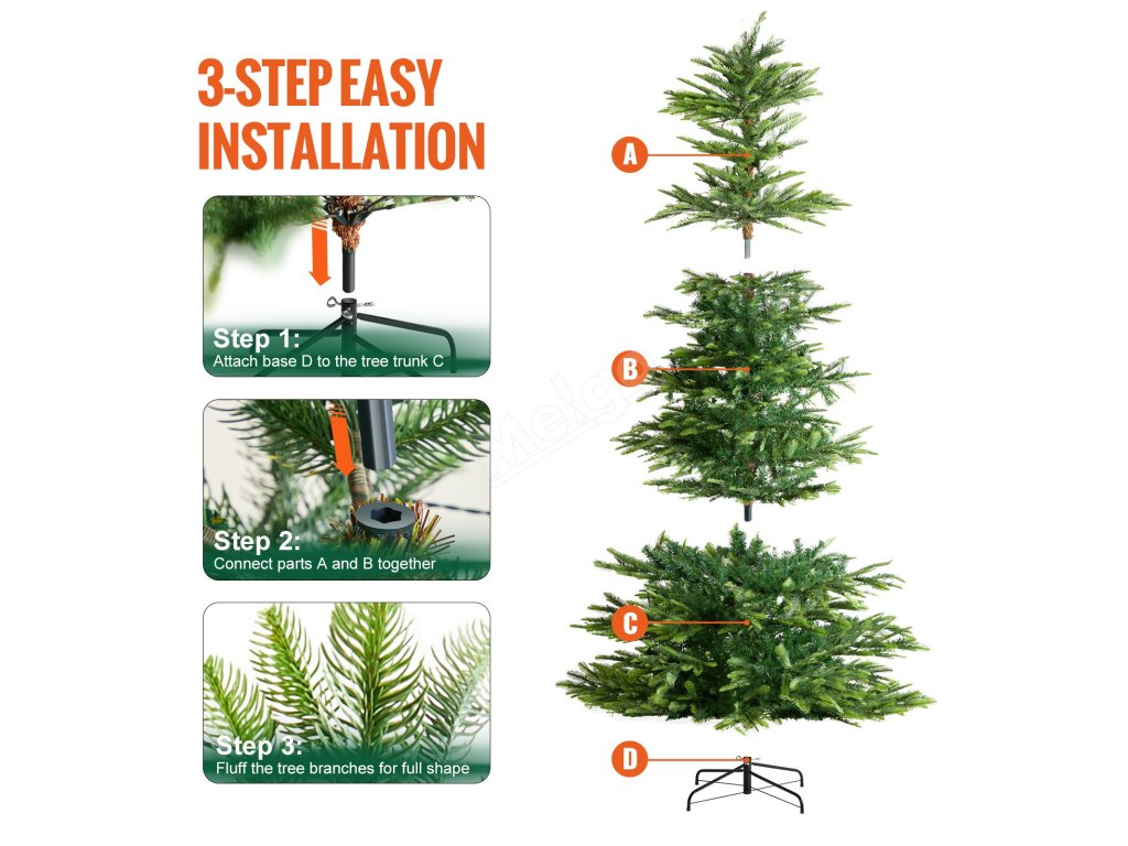 Náš sviatočný vianočný stromček je navrhnutý na bezproblémovú montáž, vďaka ktorej budú vaše prípravy na sviatky hračkou. Stačia vám 3 jednoduché kroky, aby ste stromček nastavili, našuchorili a vytvarovali konáre, vďaka čomu bude mať váš stromček svieži a prirodzený vzhľad.