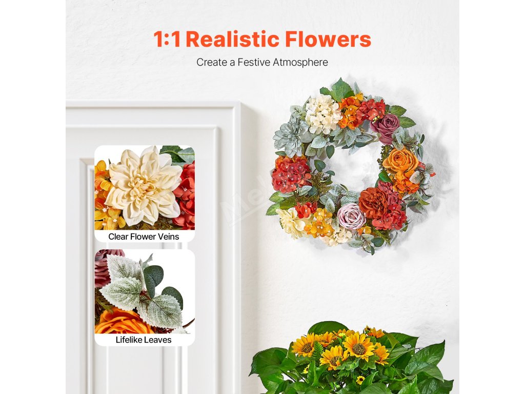 Tento realistický dekoratívny veniec v pomere 1:1 je vyrobený z vysokokvalitnej hodvábnej tkaniny, vyznačuje sa dlhotrvajúcimi farbami a zložitými detailmi. Vďaka vhodnej veľkosti, jednoduchému umiestneniu a nenáročnej údržbe je ideálny na rôzne dekoratívne úpravy domácností alebo osláv.
