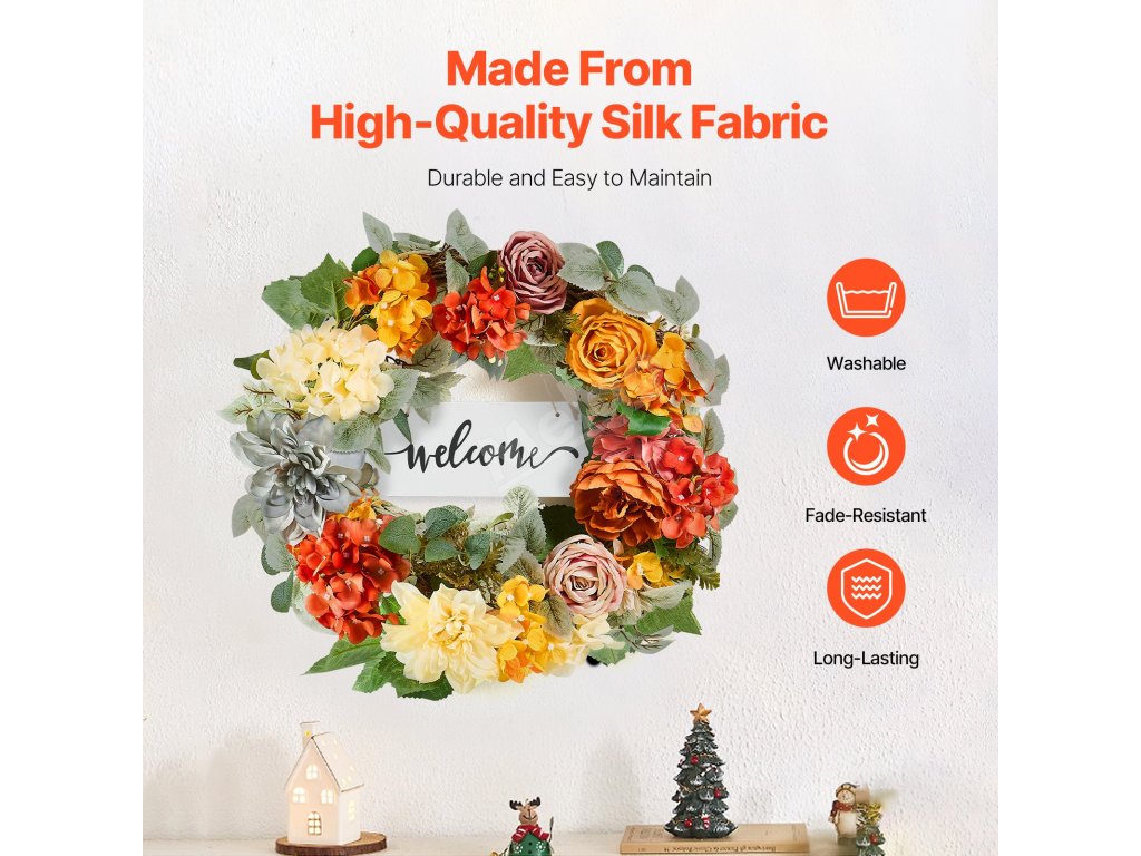 Povrch tohto venca na vchodové dvere, ktorý je vyrobený z vysokokvalitnej hodvábnej tkaniny, je hladký a odolný voči prachu, čím si zachováva žiarivé farby bez toho, aby časom vybledli. Možno ho jemne utrieť vlhkou handričkou alebo vyprať, takže je vhodný na dlhodobú dekoráciu v rôznych prostrediach.