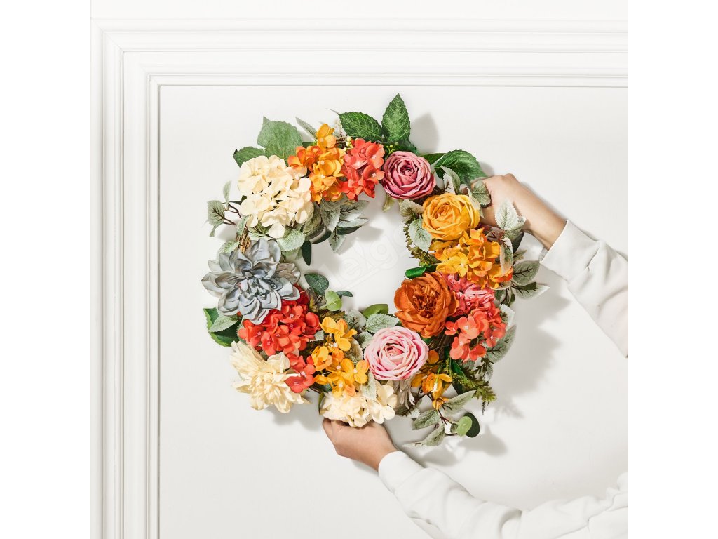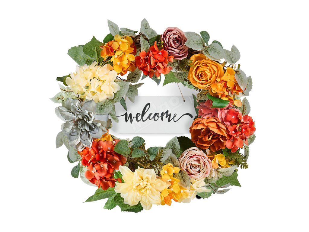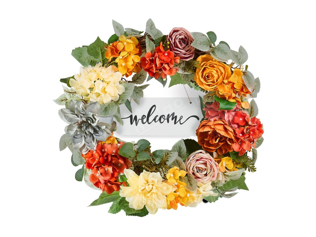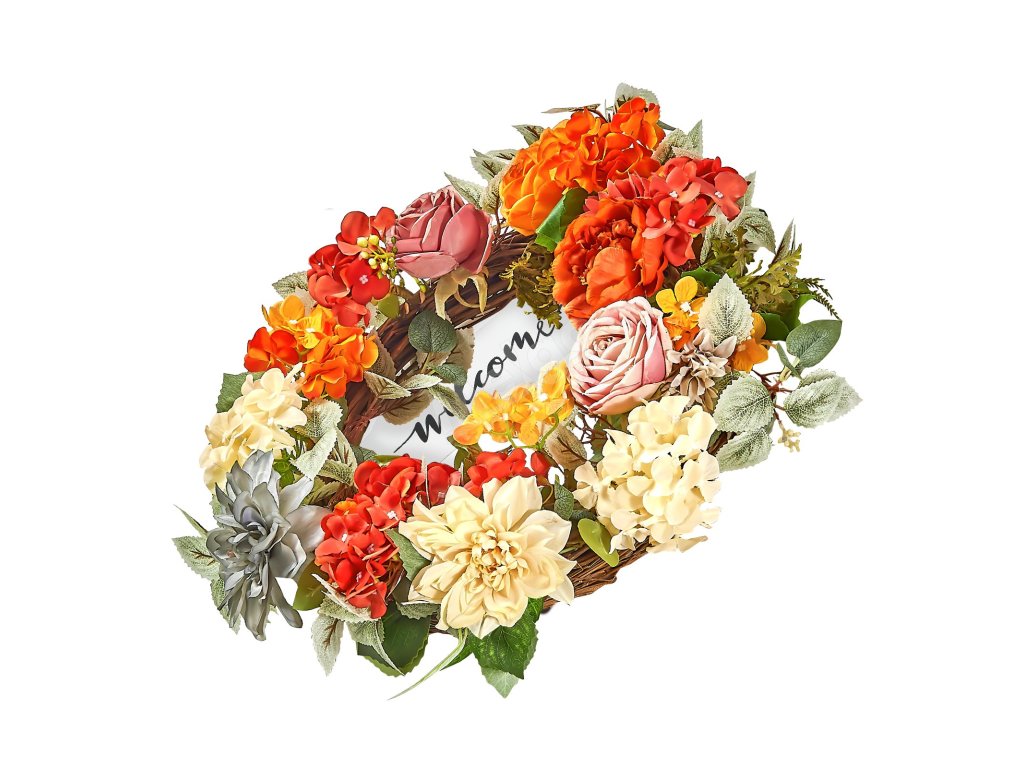 Umělý věnec 24 in, červeno-oranžovo-žlutý, hortenzie/růže, dřevo