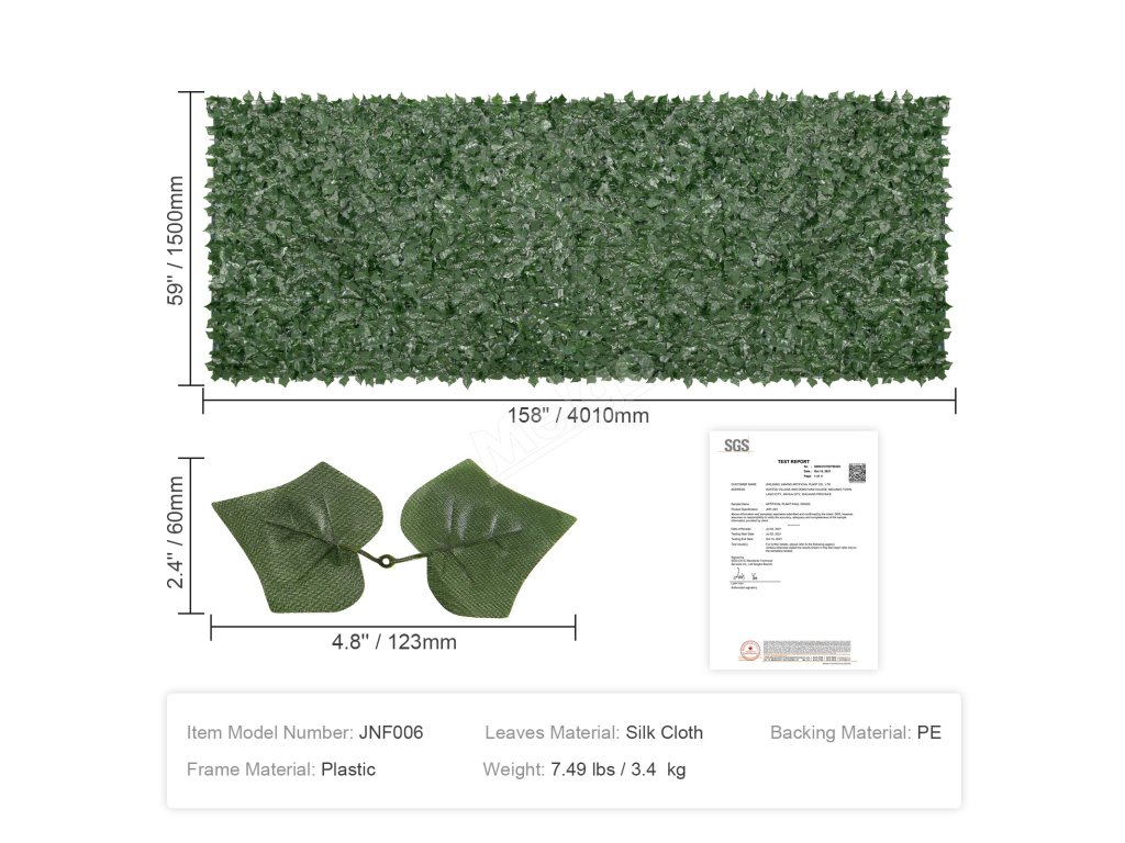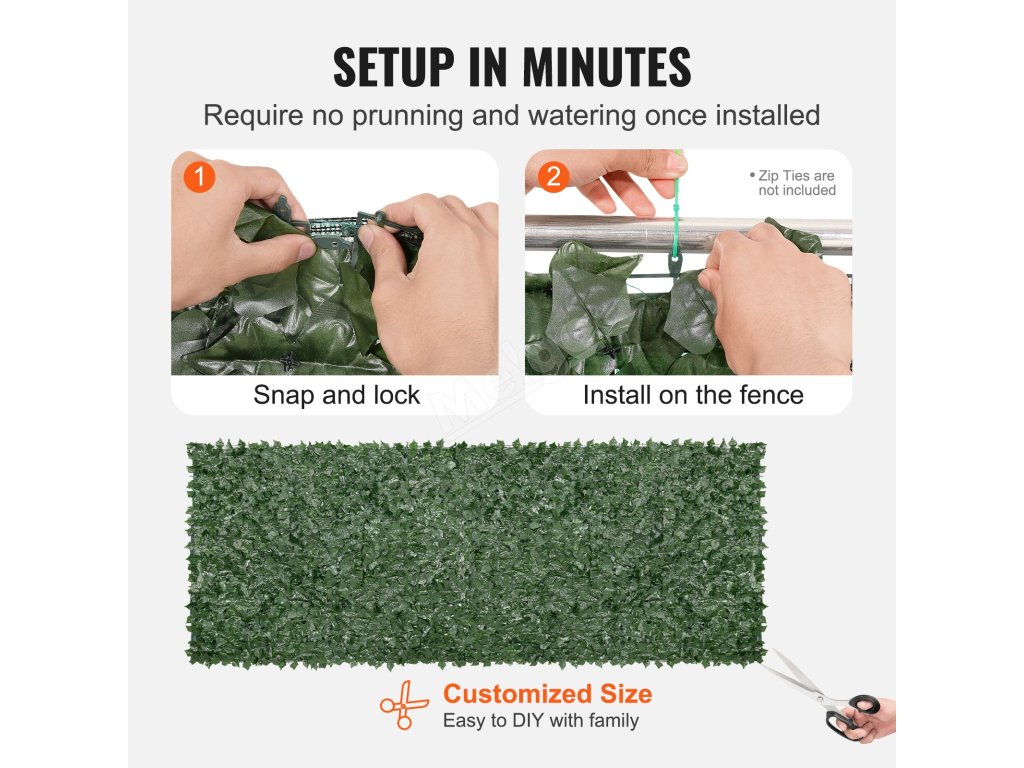 Přizpůsobení plotu s falešnými listy tak, aby vyhovoval vašim preferencím a potřebám, je snadné. Stačí je pomocí vnitřní svorky panelu nastříhat na požadovanou velikost a poté je připevnit na plot, balkon nebo do místnosti.