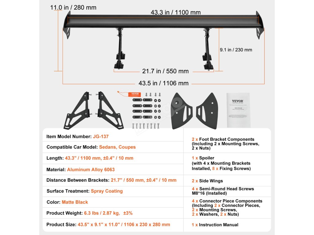 Tento univerzální spoiler je vyroben technologií nástřiku, která vytváří pokročilý matný černý povrch, který zabraňuje vyblednutí a připomíná styl závodů Formule 1. Úhel spoileru je nastavitelný.