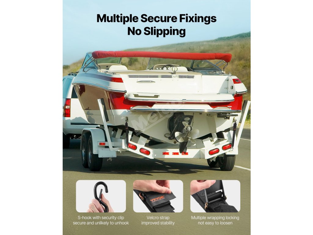 Uvazovací popruh s ráčnou se bezpečně uzamkne pomocí navíjecí konstrukce, která zabraňuje jeho rozvázání. Snadno se instaluje a dodává se s úložným pouzdrem pro pohodlné skladování.