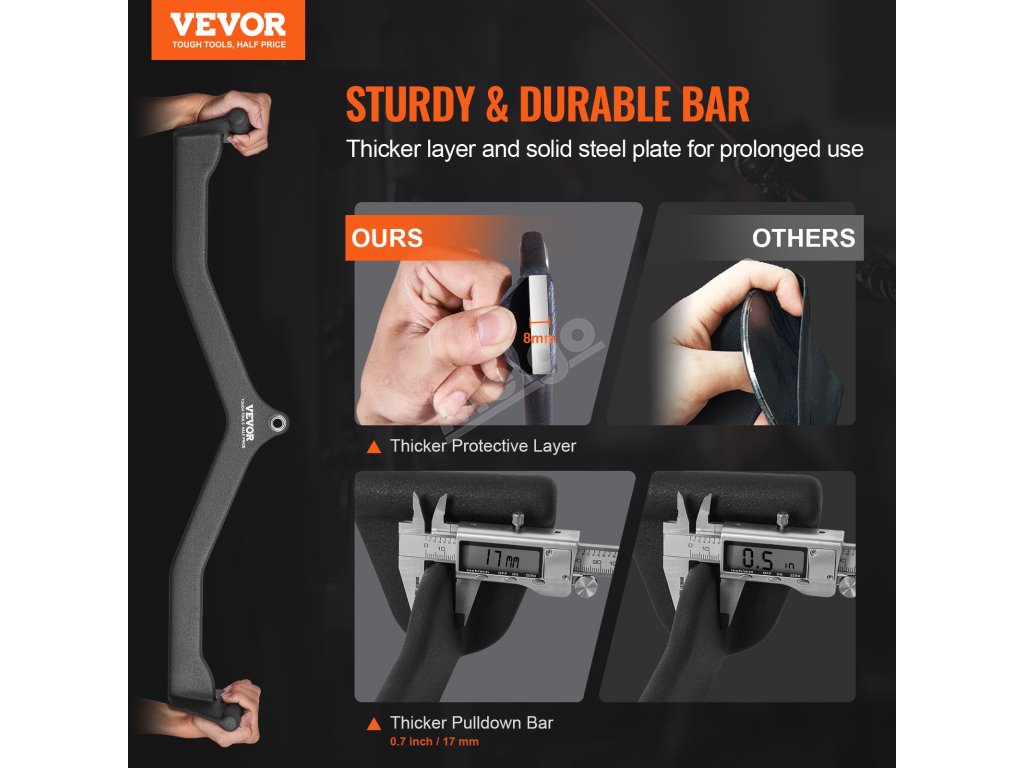 Díky silné konstrukci s pogumovaným povrchem a silné ocelové desce vydrží náš nástavec na lat pulldown i ty nejintenzivnější tréninky, aniž by se ohnul nebo praskl.