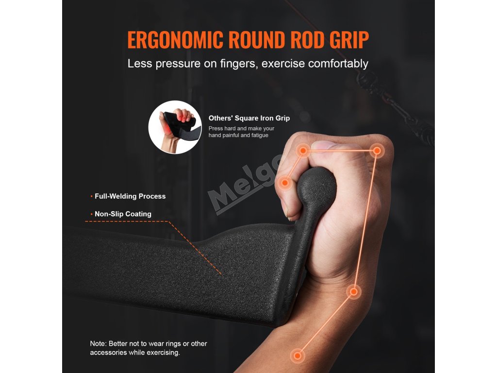 Kulatá rukojeť je odborně vyrobena celozávitovým svařováním s protiskluzovou úpravou, která minimalizuje tlak na prsty a klouby a zvyšuje účinnost i pohodlí při cvičení.