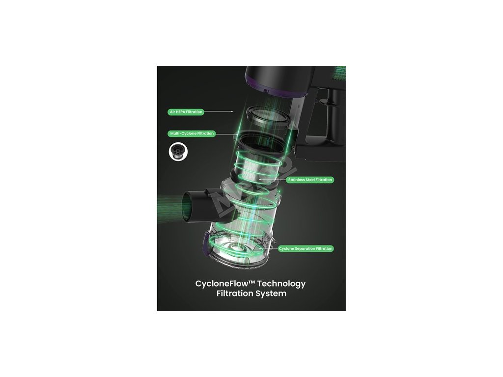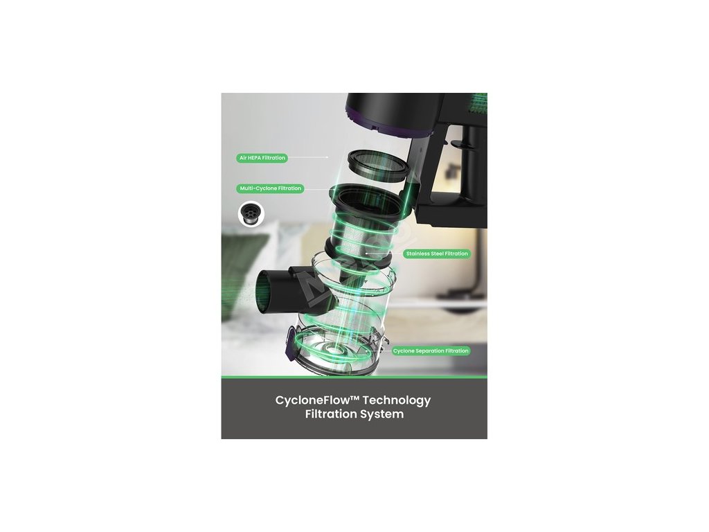 Vysavač V8 Pro je vybaven technologií CycloneFlow, čtyřstupňovým multicyklonovým filtračním systémem, který zajišťuje odfiltrování 99,97 % mikroskopických prachových částic o velikosti pouhých 0,1 mikronu, čímž zajišťuje uvolňování čerstvého vzduchu během vysávání a zabraňuje sekundárnímu znečištění vzduchu. Nádoba na prach o objemu 500 ml poskytuje slušný objem pro akumulaci prachu, aniž byste se museli starat o četnost čištění.
