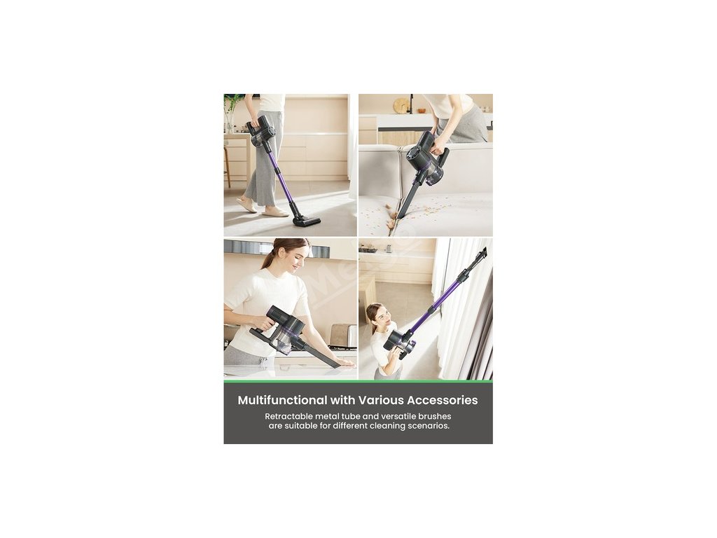| Specifikace | Sací výkon: 25KPa Režim: ECO/MAX Úroveň filtrace: 4 Volně stojící: Ano Hlučnost: 66 dB Délka trvání: 1 h: 35 min ( Eco) Baterie: 2200 mAh Objem nádoby na prach: 500 ml |