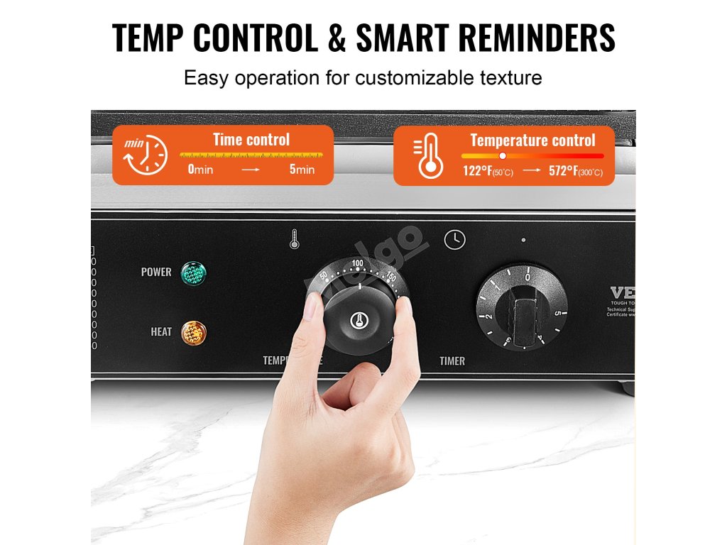 Je vybaven přesným časovačem a knoflíkem pro nastavení teploty, které jsou zřetelně označeny. Když je vafle připravena, vydá jasný zvukový signál. Vaflovač využívá uzavřenou technologii ohřevu, která zajišťuje rovnoměrný ohřev na obou stranách, rychlé tvarování a snadnou výrobu chutných vaflí.