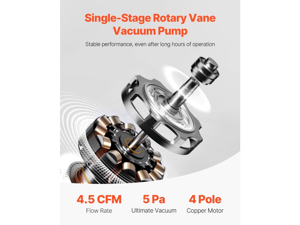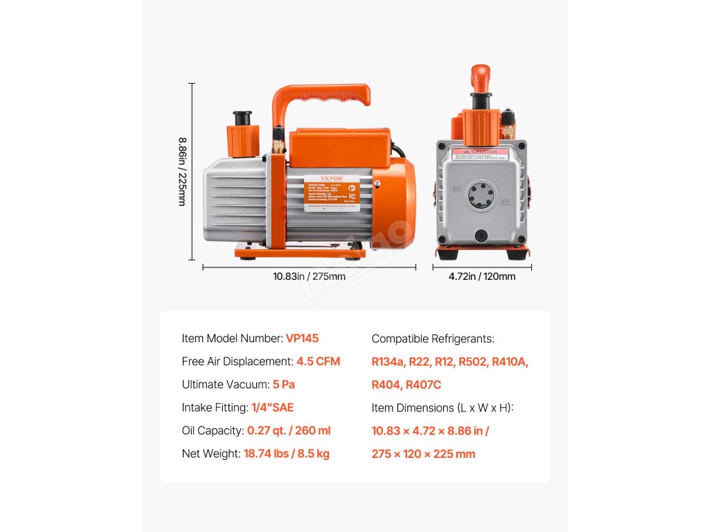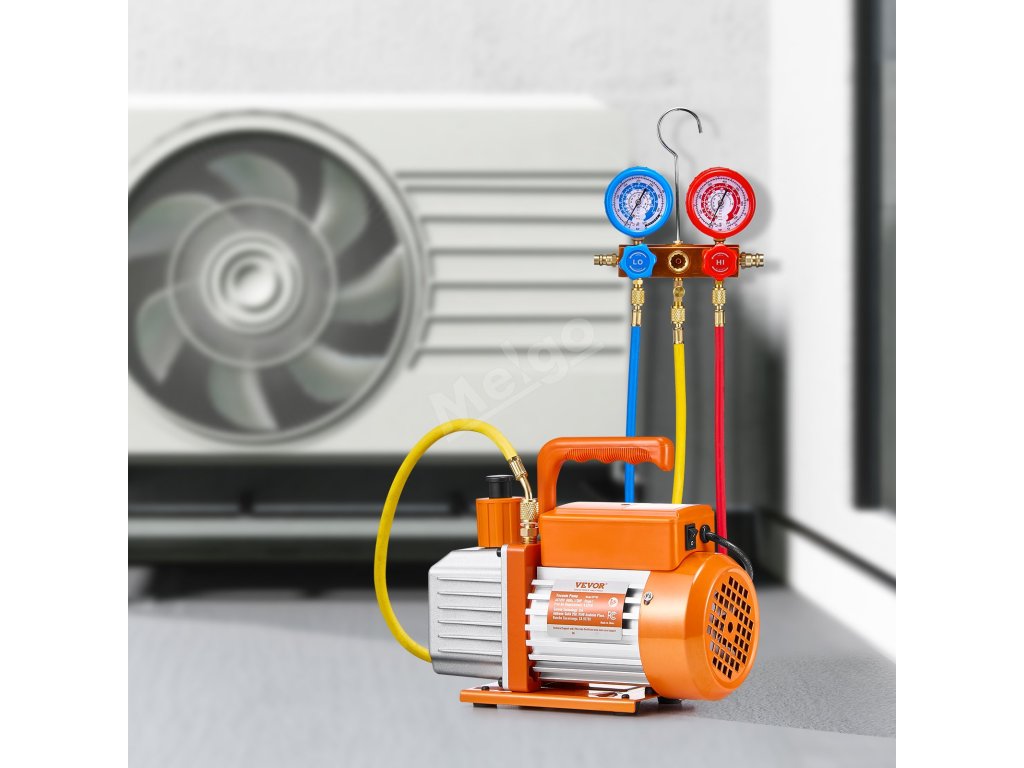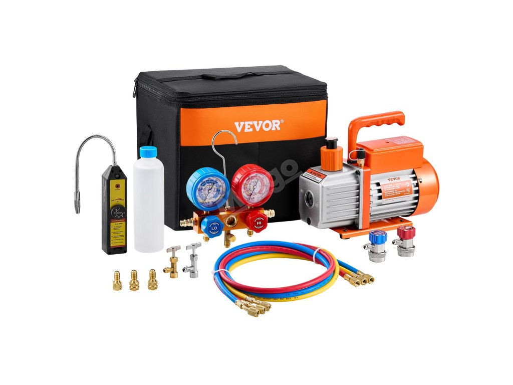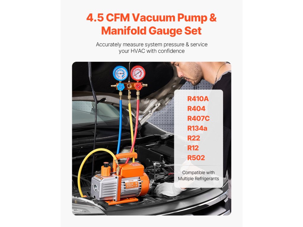 Naše sada vakuové pumpy 4,5 CFM je určena pro profesionály a kutily v oboru HVAC a obsahuje manometr PRO, 3,94 ft tříbarevné hadice a sadu rychlospojky R134a. S konečným podtlakem 5 Pa je kompatibilní s chladivy R134a, R22, R12, R502, R502, R410A, R404 a R407C.