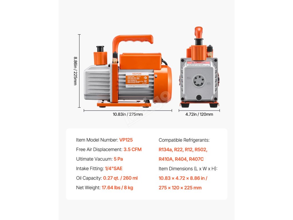 Naše sada vakuové pumpy 3,5 CFM, která je speciálně navržena pro profesionály a kutily v oblasti HVAC, obsahuje manometr PRO, 3,94 ft tříbarevné hadice a sadu rychlospojek R134a. S konečným podtlakem 5 Pa je kompatibilní s chladivy R134a, R22, R12, R502, R502, R410A, R404 a R407C.